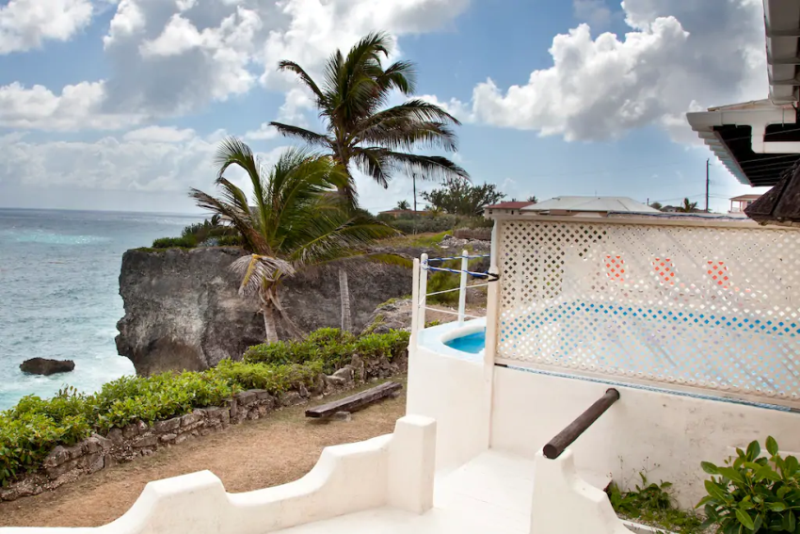 This romantic location is ideal for those who wish seclusion, want R & R, peace and serenity and require a measure of privacy. A car is recommended.The villa is situated on the edge of a 100ft cliff with an exquisite panoramic view of the sea,caressed by constant prevailing easterly sea breezes. Featuring natures own solid coral stone walls and exposed beams,this three bedroom and two bathrooms (one ensuite) vacation villa can comfortably accomodate up to 6 vacationers. The master bedroom with AIR CONDITIONING has a queen-size bed, with en-suite bath.The other two bedrooms have 1 queen-sized bed. (NO AC)and 1 king-size bed (or two twin beds).+AC.
