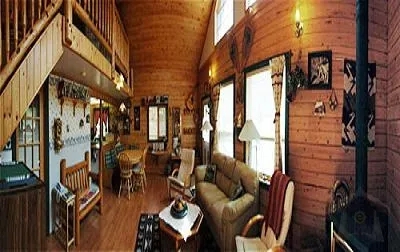 This complete vacation rental log-cabin consists of a main floor and an upper floor loft. The loft contains a queen bed and a double bed. It overlooks the main floor's living room and dining area from its 200 square foot "open" floor plan. The main floor is laid out into a large living room, bedroom with a queen size bed, a dining area, a full kitchen and two bathrooms, one full and the other a half-bath. In the living room is a fully operational wood-burning fireplace, decorative musical instruments: violin a satellite TV, a DVD player, a VCR player and a selection of movies. There also is a small library and selection of games. There are two decks to this vacation renal cabin, a small one in the back and a large one in front. There is plenty of on-site parking.