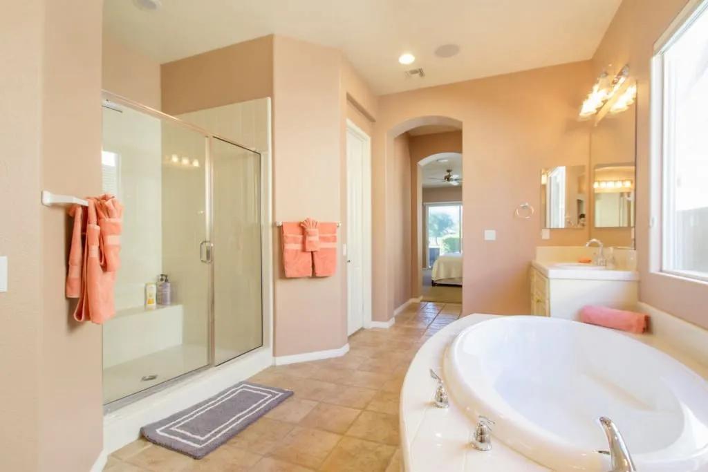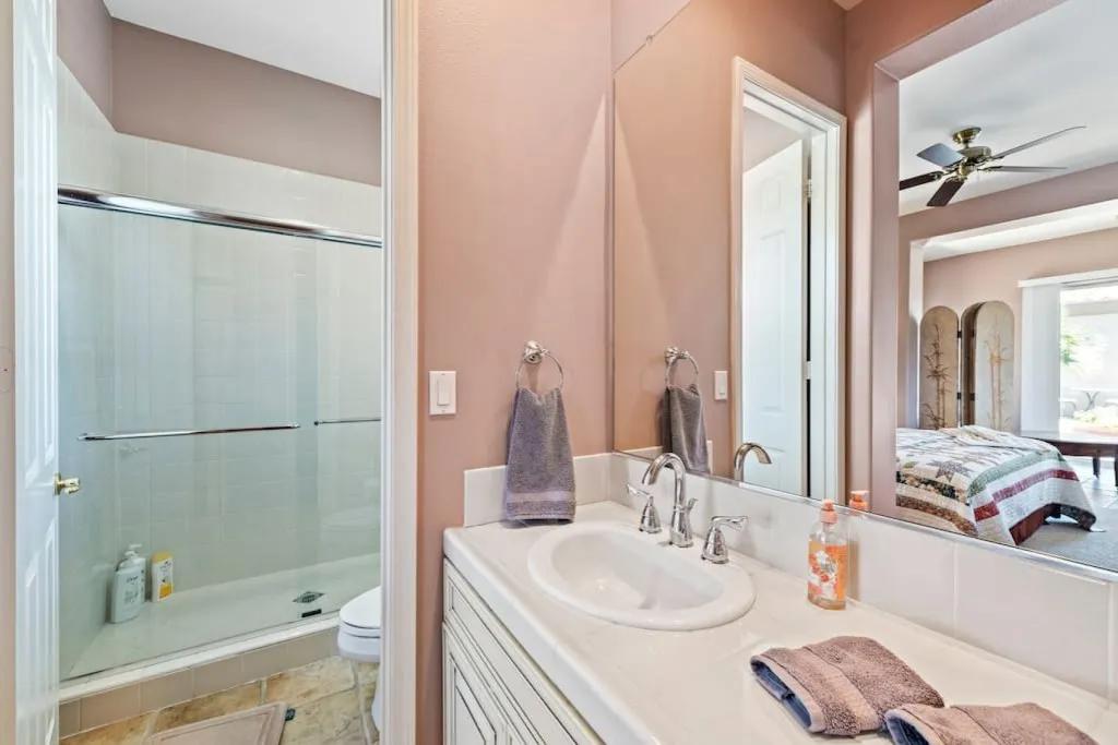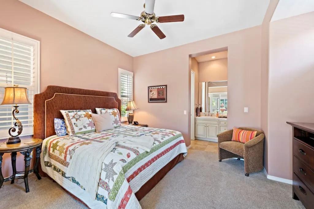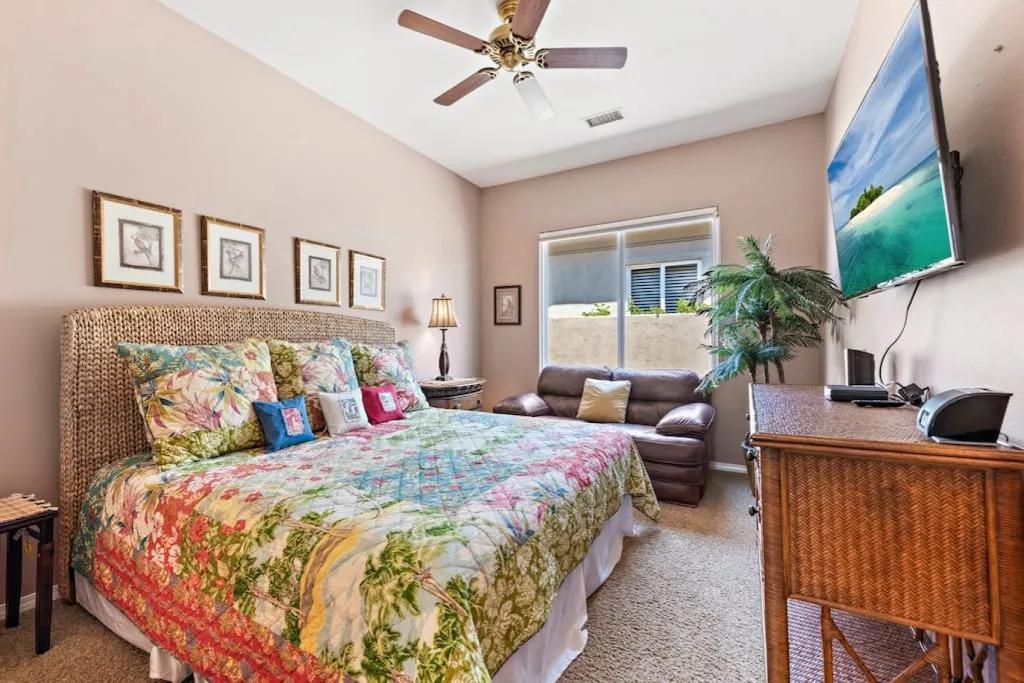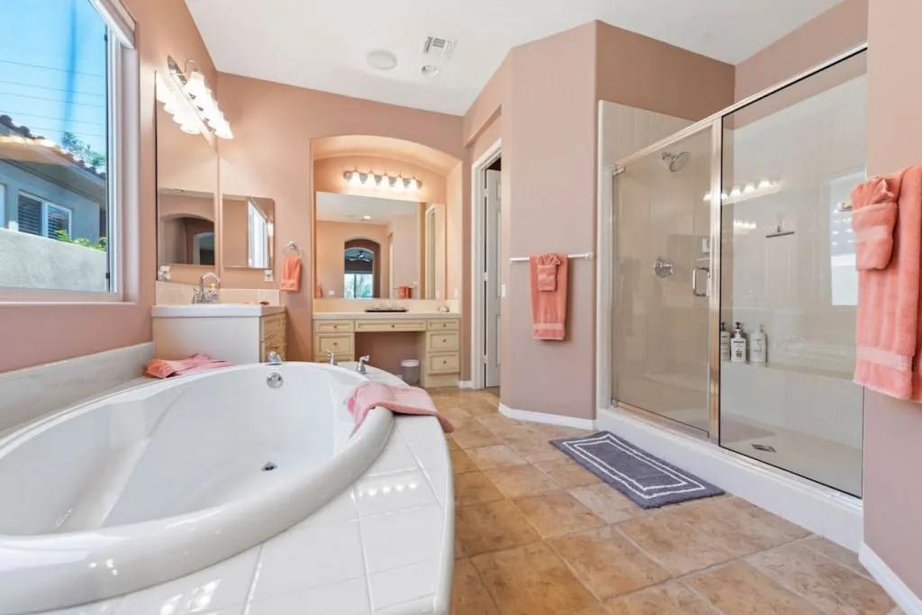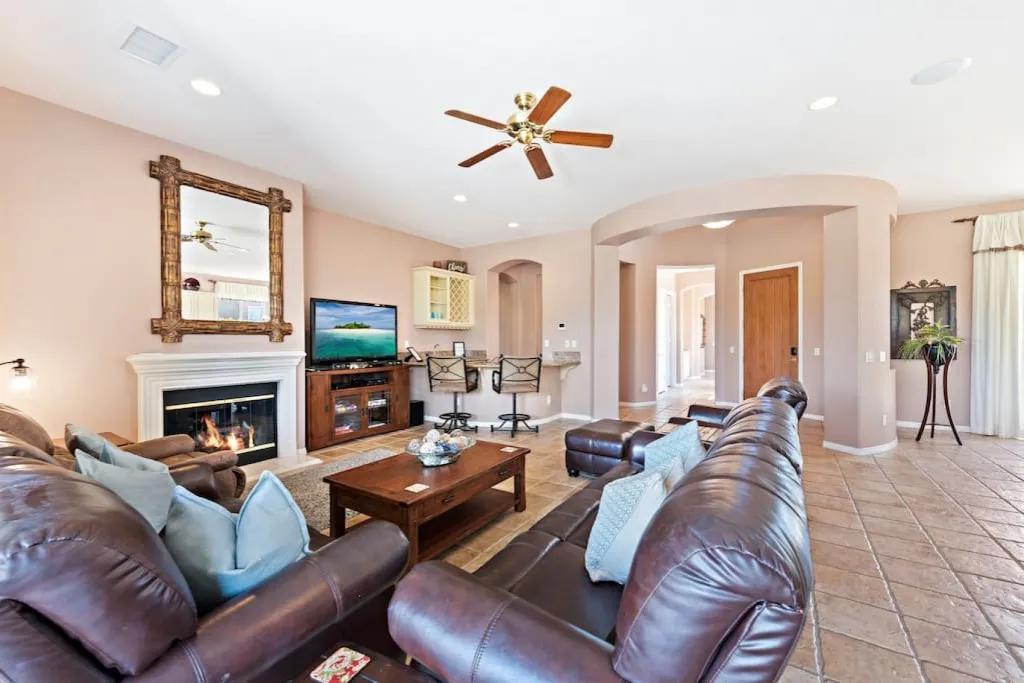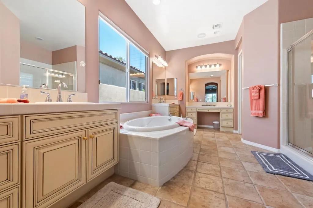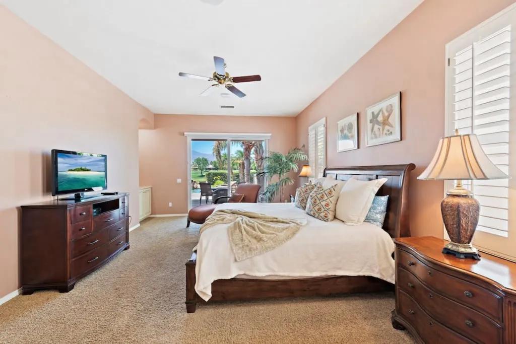 57615 Seminole · PGA West, heated pool, best views, vacation+++, Beautiful Villa rental in La Quinta has 3 bedrooms, 3 bathrooms, 8 sleeps, 1 minimum stay Villa for rent in La Quinta California with the amenities and near by attractions , Air Conditioning, Balcony, Carbon-monoxide detector, Fireplace, Heating, Hot Tub, Kitchen, Parking, Smoke detector, Swimming pool, Washing Machine, Wireless Internet, Hair Dryer , Hangers, Iron & Board , Shampoo, Washer/Dryer Suitable for infants, Suitable for children, Family/kid friendly, Essentials, Bathroom type:private