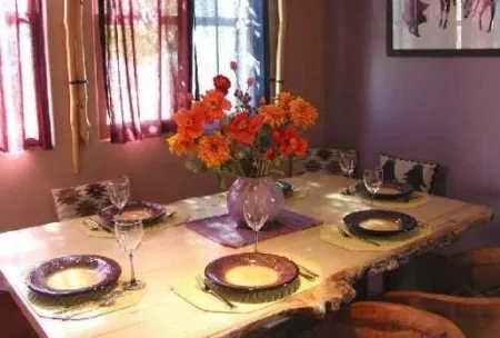 Alta Vista, furnished and appointed by a professional interior decorator, is one of the outstanding Taos Vacation Rentals offered by Taos Premiere Properties Vacation Rentals. Mountain views abound and privacy extraordinaire for the private hot tub is afforded by the “coyote fence” so popular in Santa Fe and Taos, New Mexico. The professionally landscaped and fully enclosed yard offers a grand portal (covered patio) adding to the luxury of outdoor living under New Mexico skies. Enjoy outdoor living in any kind of weather and any time of day or night under this custom built upgrade with exquisite nighttime lighting and artfully crafted flagstone base. Both bedrooms offer their own satellite TV and stereo system. The open living room also has satellite TV, Stereo and in addition DVD player. The well-equipped kitchen offers a full line of cookware and dinnerware for gourmet cooking and gracious entertaining. An open floor plan and ample windows give this special home a light, bright and airy ambiance. Being easily located between the town of Taos and Taos Ski Valley means no hassle driving for reaching one of Taos Premiere Properties most popular 2 bedroom / 2 bathroom Taos vacation rentals.