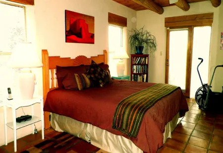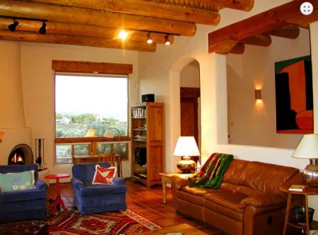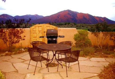 A centrally located cupola with clerestory windows facing all directions provides light to the house. The house has three spacious master bedrooms, each with a private bath (in addition to a half bath for visitors). All rooms have their own outside/inside access to the walled gardens and patios allowing several couples or families to co-exist with privacy. This very comfortable, light-filled Taos vacation rental home with beautiful views is located approximately four miles from the town of Taos New Mexico and 12 miles from Taos Ski Valley. Centrally located and brilliantly designed this home is a true vacation lodging winner!