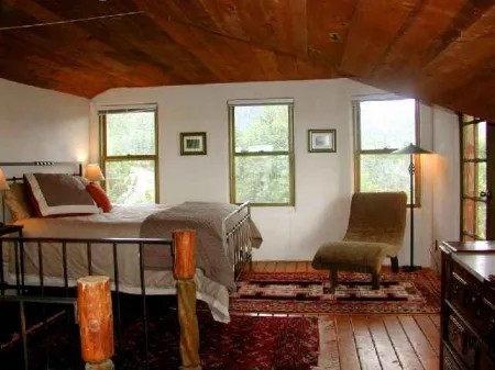 Casa La Ceja offers the best of all worlds – sweeping mountain and valley views of outstanding scenic beauty and seclusion with direct and easy access to dinning, shopping, skiing, hiking, and much more. The house and separate studio guest house offer eclectic decor and abundant amenities with plenty of room to relax inside and out. This unique, multi-level home features a King bed in the loft and queen bedroom downstairs, two full baths, a spacious living room with river rock gas kiva fireplace, separate dining room, kitchen, and sunny family room (sun room) with wood-burning cast iron stove. The upstairs study in the loft is a perfect place to nestle with a book, or you may decide to sit on the upper or lower decks to view the mountains or valley. A daybed with trundle adds sleeping for 2 children in semi open loft separated by the open stair way.