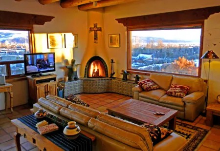 Lovely, light, bright and airy, open floor plan, 2 BR Holiday Travel Ski Adobe Home situated on 1 acre, with outstanding views of mountains from Questa to Truchas, located between the Taos Ski Valley and the Taos vvillage plaza. A completely private setting, high up on a desert ledge with easy access year round. Outdoor hot tub for star gazing at night. Two kiva fireplaces, a formal dining room and a fully equipped kitchen. An outdoor "Fire Pit" provides evening fire light and warmth as guests gaze across the evening valley lights. Casa Vista Grande is one of Premiere's largest 2 bedroom 2 bathroom Taos Ski Vacation Rental Travel Homes.