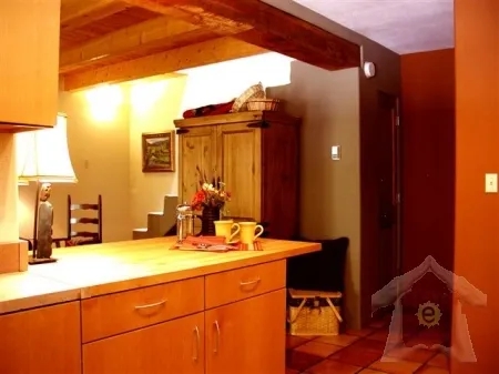 Five minutes walk from the Taos Plaza and along Kit Carson Road finds you in a most tasteful Taoseno 2 BR Holiday Travel Townhouse. Quiet, yet centrally located is a charming light artist's Ski Holiday Travel Home with private latilla fenced yard and ample private parking. This fully furnished comfortable Ski Vacation Home Rental offers 2 bedrooms one with its own balcony, 1.5 bathrooms. Saltillo tile throughout the living and kitchen area is complemented by the intimate beamed ceiling and a wonderful kitchen with sandstone countertops, a large butcher block dining counter seating 4 and a separate dining table also seating 4. Wi-Fi access. Make this charming Taos 2 BR Ski Vacation Travel Rental Townhouse you vacation home away from home.