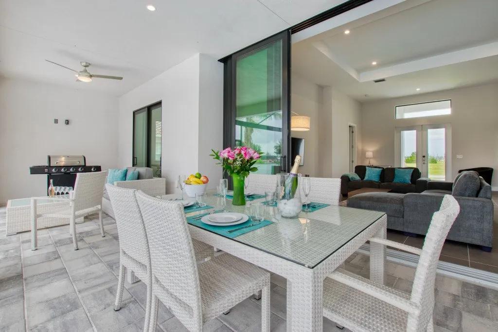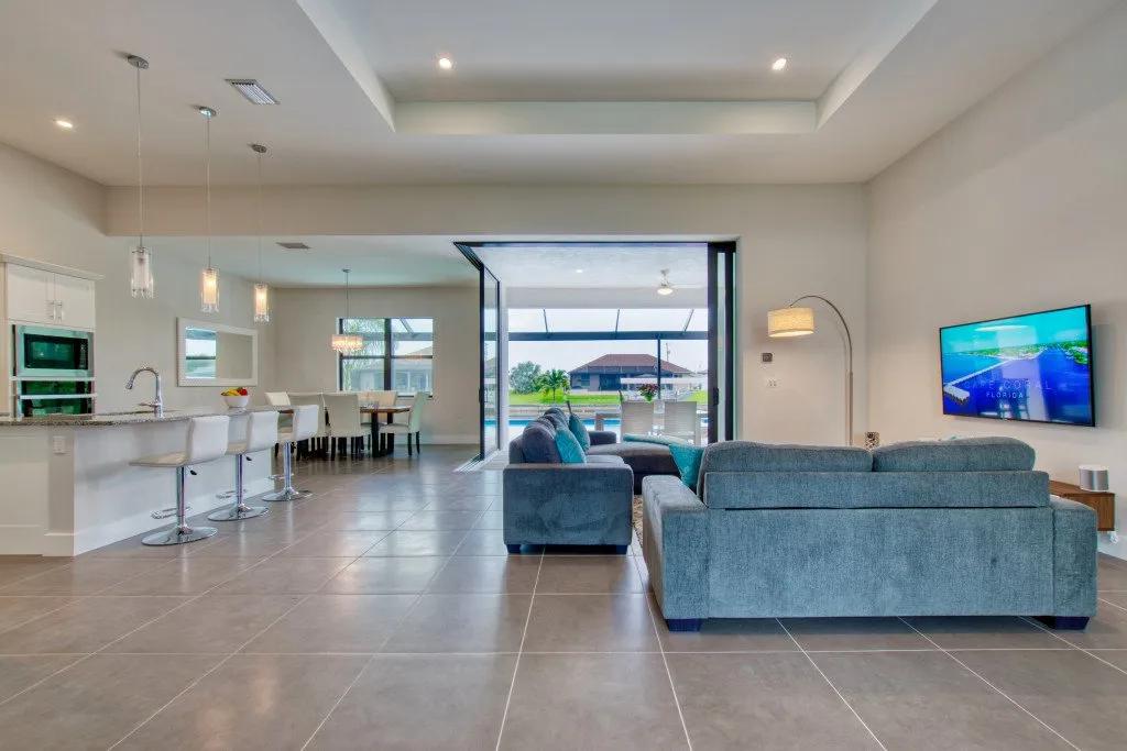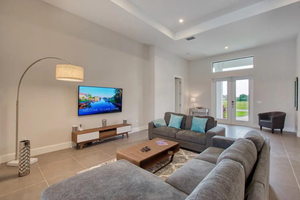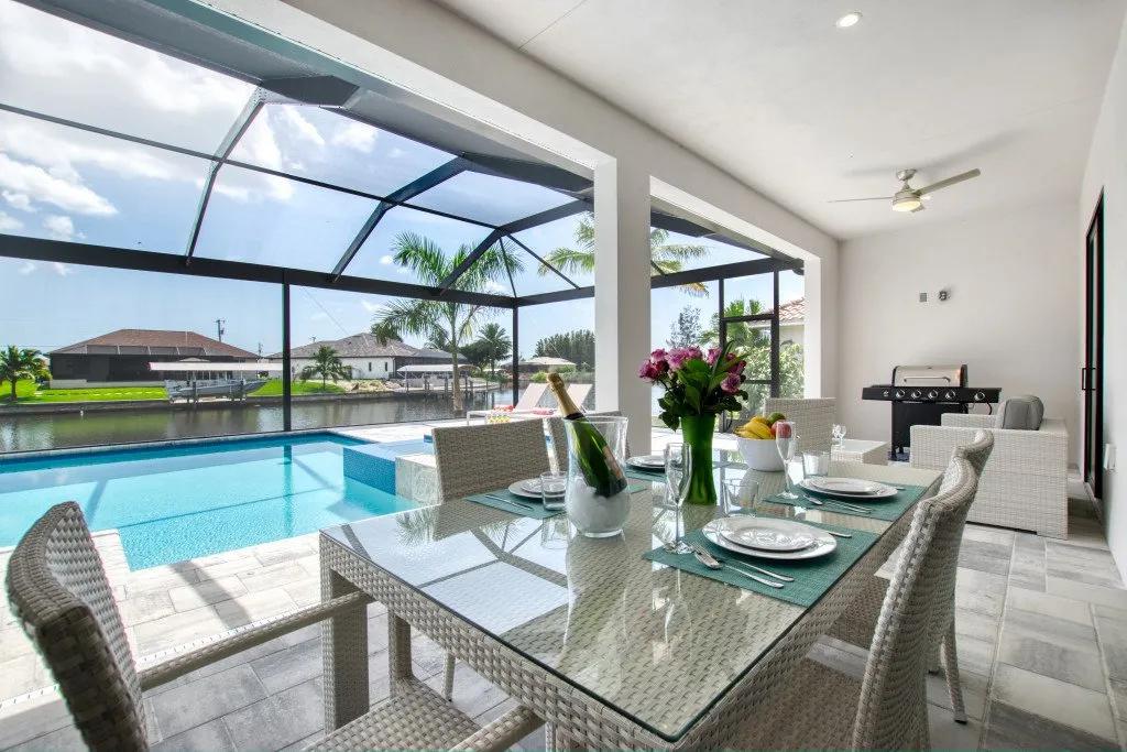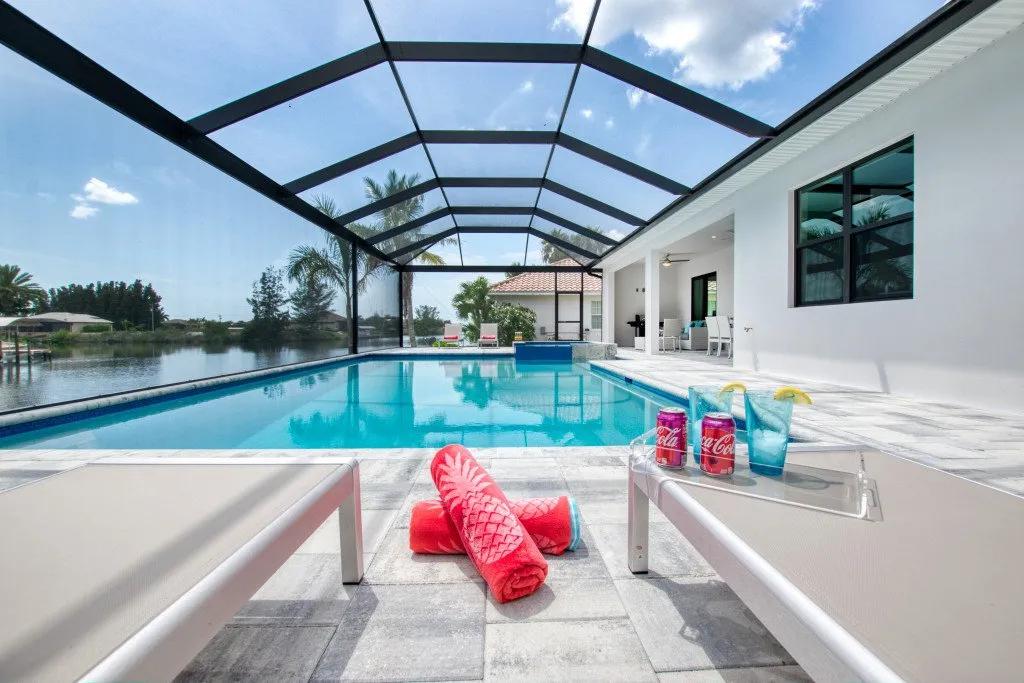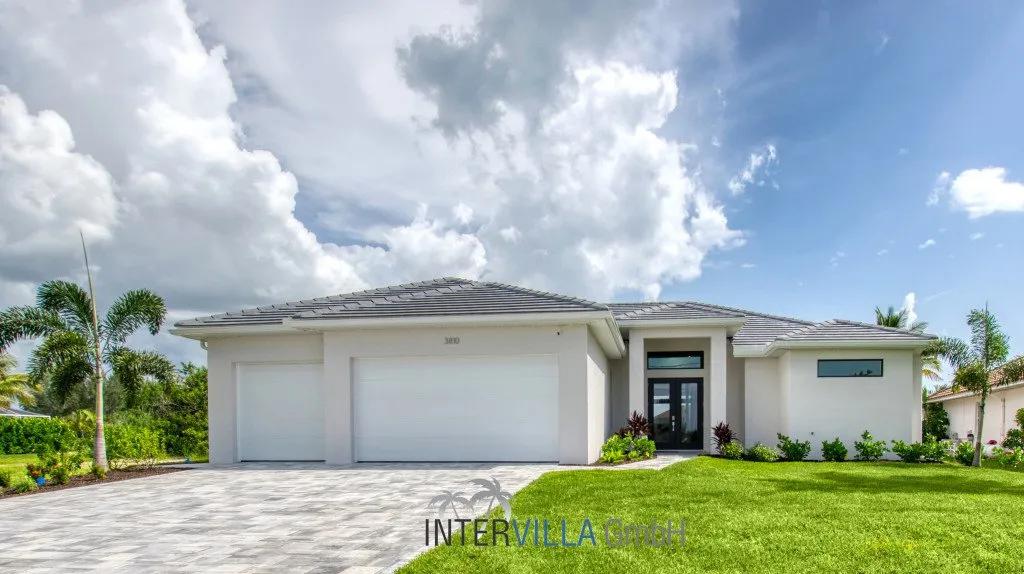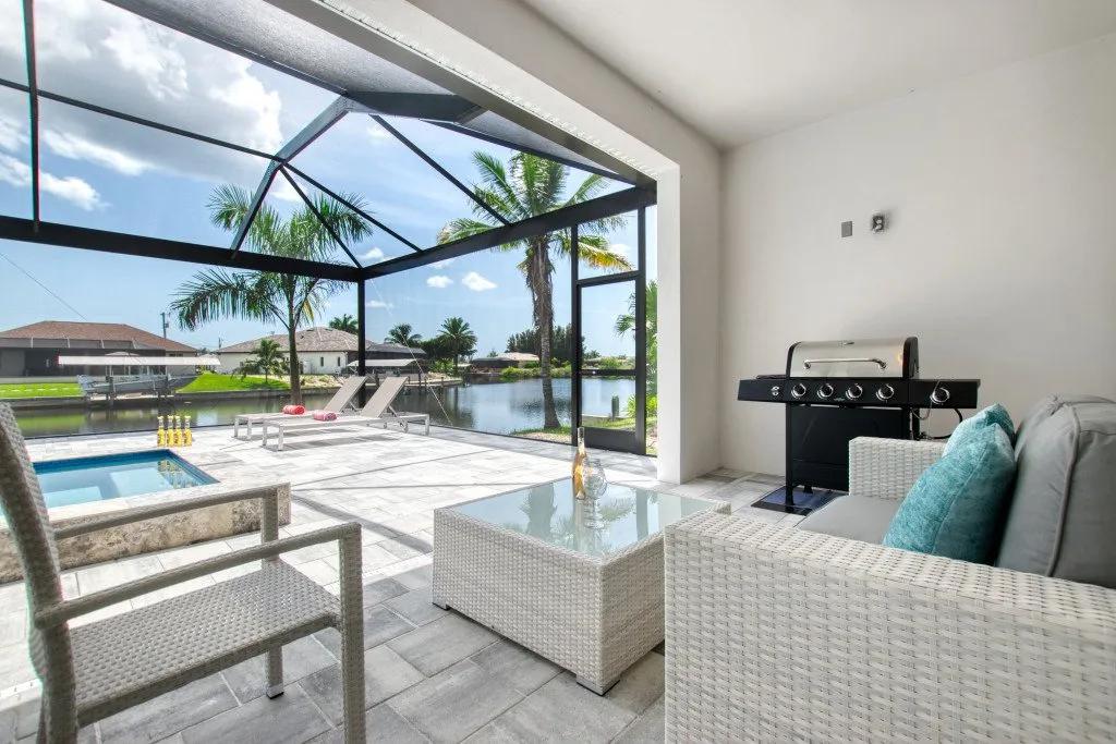 Intervillas Florida - Villa Cayman, Beautiful Villa rental in Cape Coral has 3 bedrooms, 2 bathrooms, 6 sleeps, 7 minimum stay Villa for rent in Cape Coral Florida with the amenities and near by attractions , Air Conditioning, Balcony, Beach Chairs, Communal Pool, Free WiFi, Full Kitchen, Garage, Heated Pool, Internet, Kid Friendly, Linens Provided, No Pets Allowed, Non-Smoking, Parking, Private Pool, Swimming pool, Towels Provided, Washing Machine, Wireless Internet, Clothes Dryer, Ice MakerOutdoor Whirlpool, Salt water pool, Apple TV, Netflix, Sonos sound system, Golf, Luxury Homes, Beach towels, Coolbox, Covered seating area, Garden, 6 Garden-Chairs, 4 Deck-Chair, Cutlery & Glasses, Ceramic / ceramic hob, Kitchen bar, Cold water dispenser