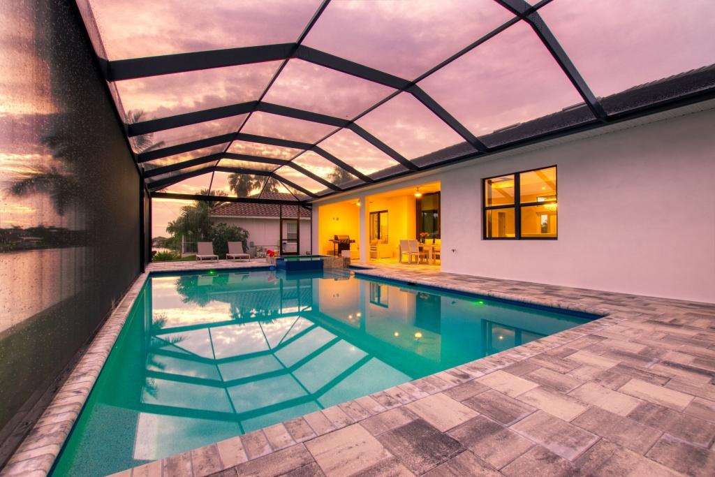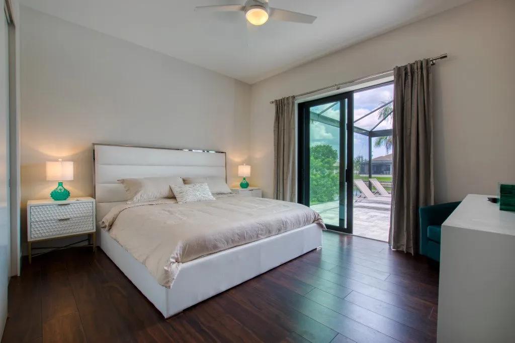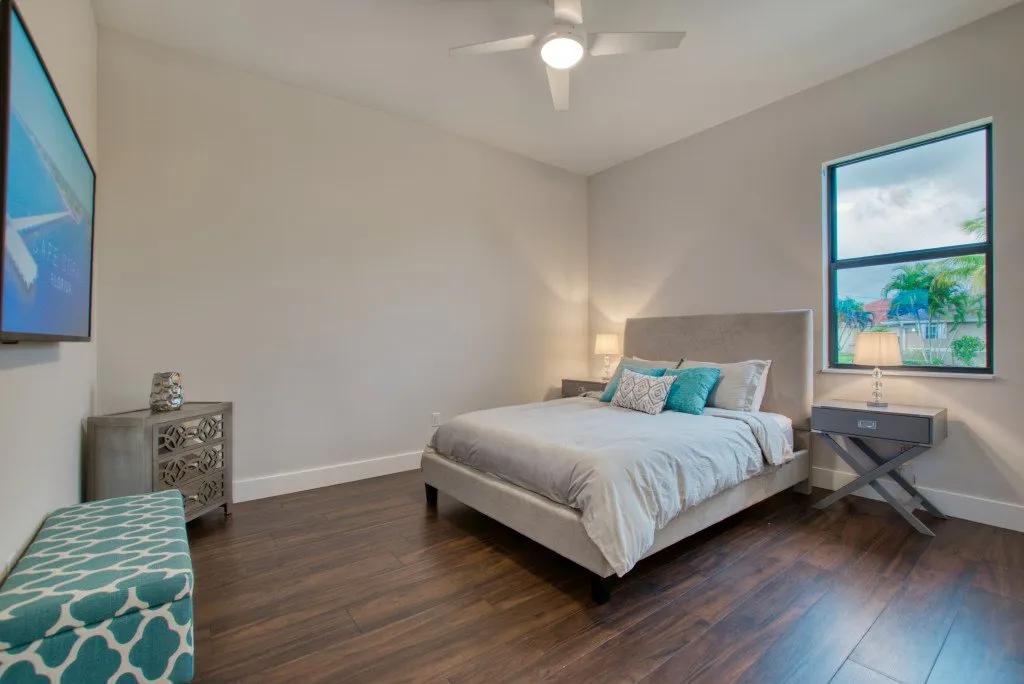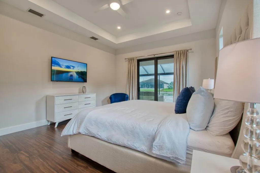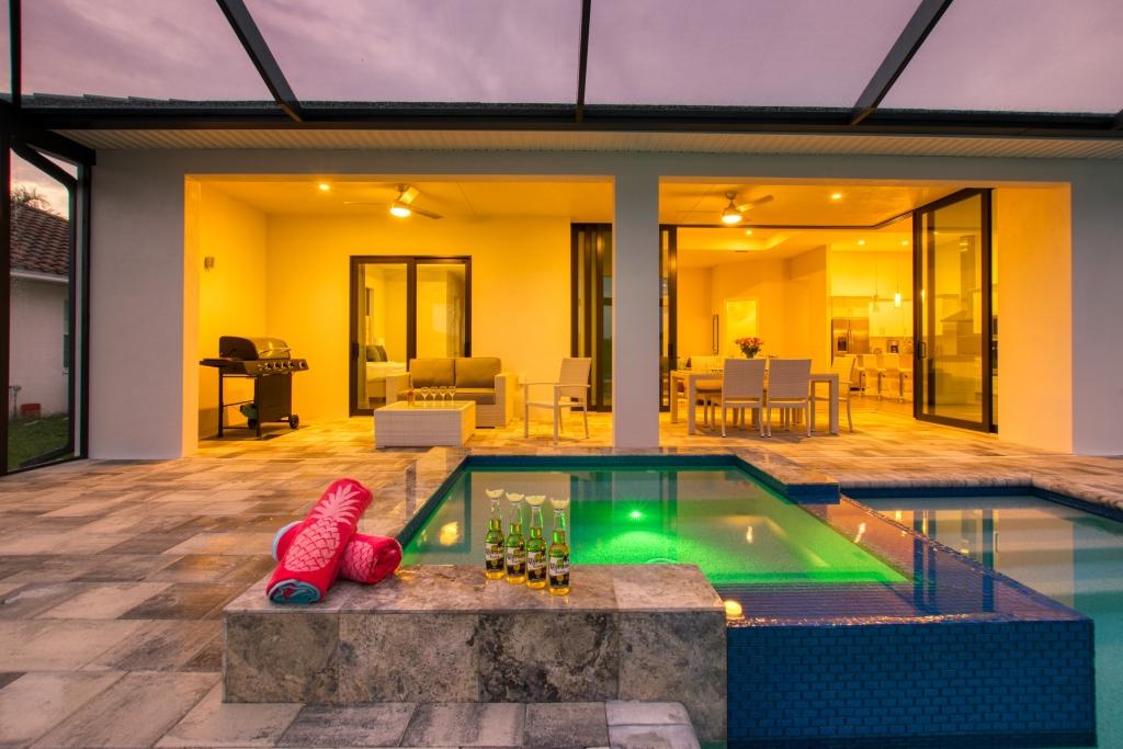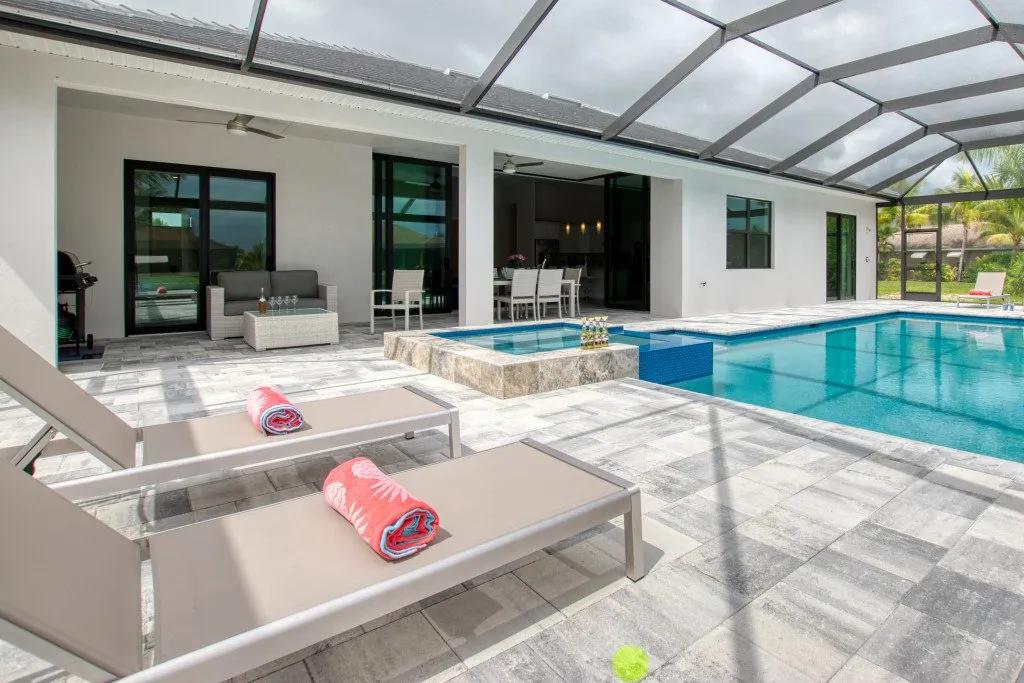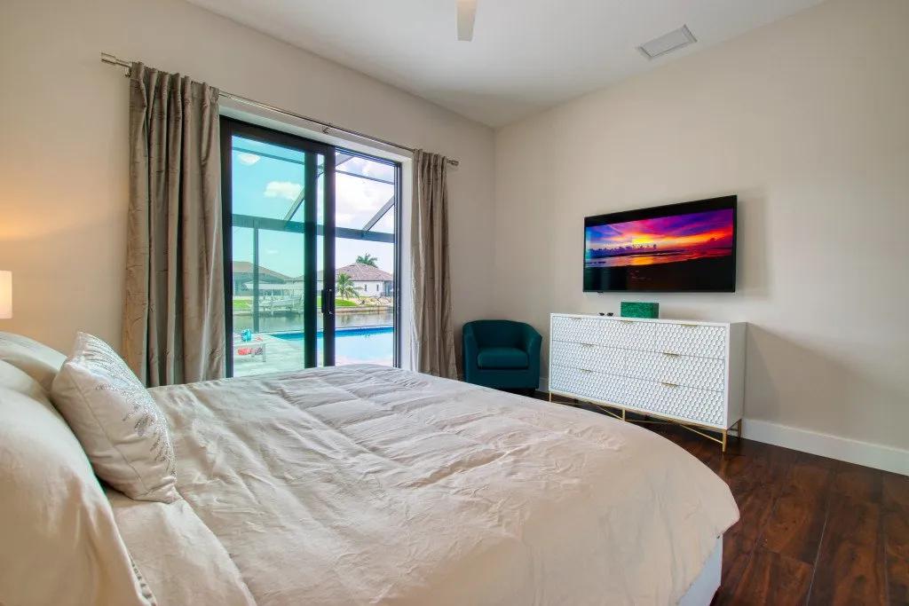 Intervillas Florida - Villa Cayman, Beautiful Villa rental in Cape Coral has 3 bedrooms, 2 bathrooms, 6 sleeps, 7 minimum stay Villa for rent in Cape Coral Florida with the amenities and near by attractions , Air Conditioning, Balcony, Beach Chairs, Communal Pool, Free WiFi, Full Kitchen, Garage, Heated Pool, Internet, Kid Friendly, Linens Provided, No Pets Allowed, Non-Smoking, Parking, Private Pool, Swimming pool, Towels Provided, Washing Machine, Wireless Internet, Clothes Dryer, Ice MakerOutdoor Whirlpool, Salt water pool, Apple TV, Netflix, Sonos sound system, Golf, Luxury Homes, Beach towels, Coolbox, Covered seating area, Garden, 6 Garden-Chairs, 4 Deck-Chair, Cutlery & Glasses, Ceramic / ceramic hob, Kitchen bar, Cold water dispenser
