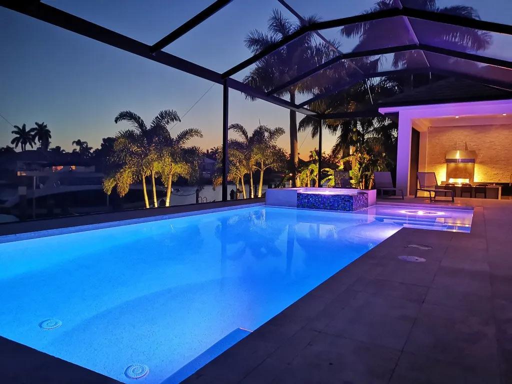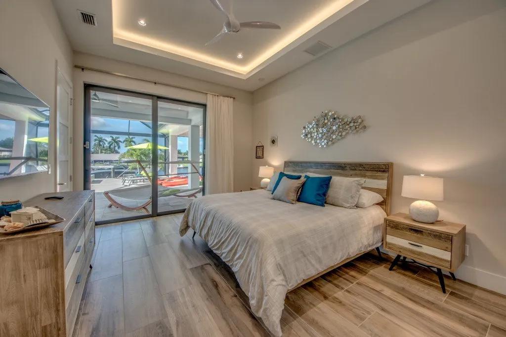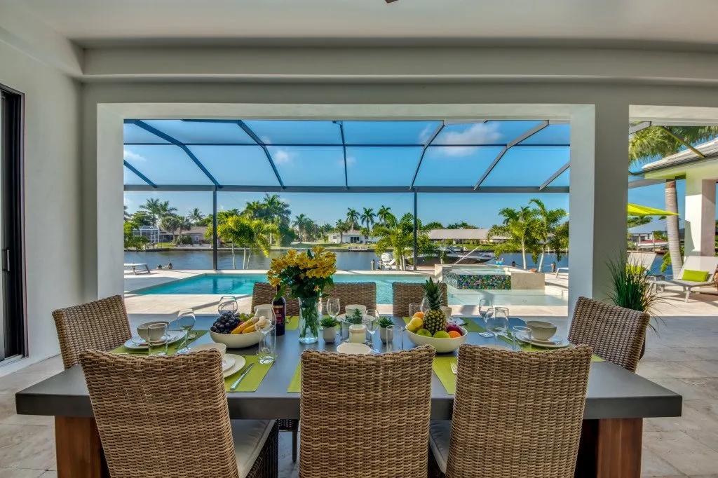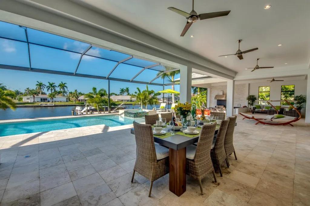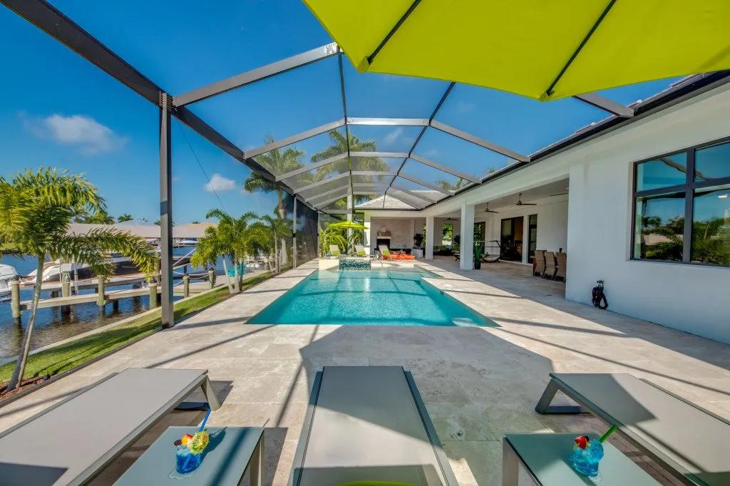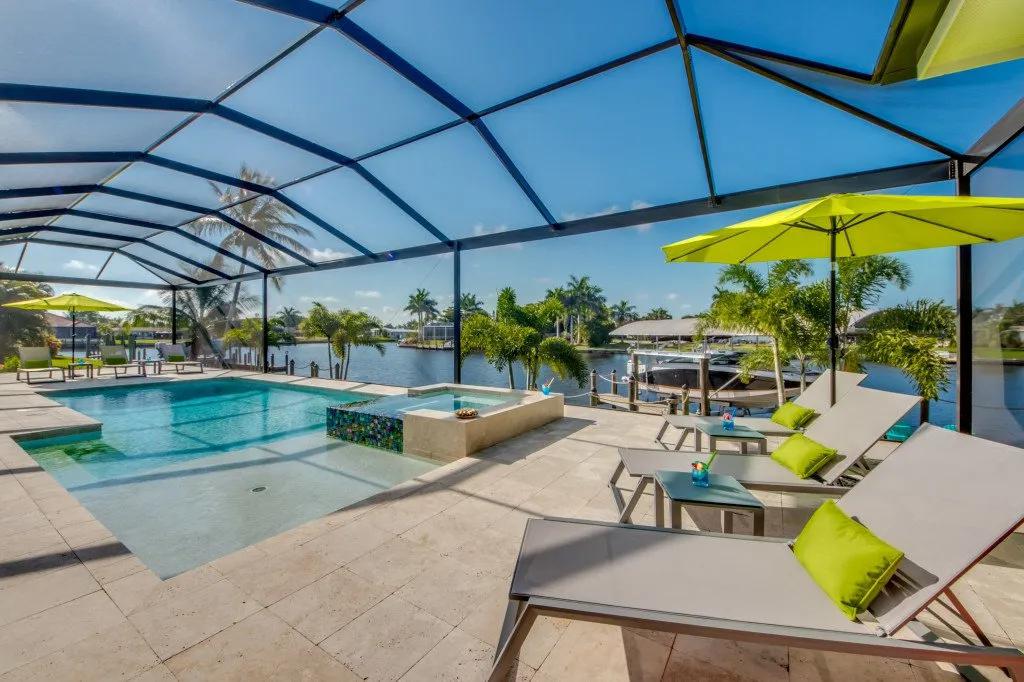 Intervillas Florida - Villa Pure Balance, Beautiful Villa rental in Cape Coral has 4 bedrooms, 4 bathrooms, 8 sleeps, 7 minimum stay Villa for rent in Cape Coral Florida with the amenities and near by attractions , Air Conditioning, Balcony, Bicycles, Deck/Patio, Dock/Boat Slip, Free WiFi, Full Kitchen, Garage, Heated Pool, Hot Tub, Internet, Kayak / Canoe, Kid Friendly, Lanai, Linens Provided, No Pets Allowed, Non-Smoking, Parking, Ping Pong Table, Private Pool, Swimming pool, Towels Provided, Washing Machine, Wireless Internet, Blender, Cable/Satellite TV, Ceiling Fans, Clothes Dryer, Coffee Maker , Dishes & Utensils, Dishwasher, DVD Player, Freezer, Hair Dryer , Ice Maker, Iron & Board , Microwave, Outdoor Grill, Oven, Refrigerator, Stove, Telephone, Television, Toaster, Washer/Dryer Salt water pool, Barbecue Outdoor Kitchen, German Programs, Outdoor Whirlpool, Spa, Highspeed WLAN, soundbar, books, Board Games, Golf, Luxury Homes, Beach towels, Coolbox, Bath towels, Covered seating area, 8 Deck-Chair, 2 Garden-Chairs, Boat lift, Cutlery & Glasses, Barbecue, Ceramic / ceramic hob, Cold water dispenser, Kitchen bar, High Chair, sun loungers