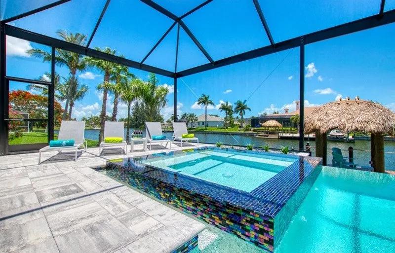 Intervillas Florida - Villa Cataleya, Beautiful Villa rental in Cape Coral has 3 bedrooms, 3 bathrooms, 6 sleeps, 7 minimum stay Villa for rent in Cape Coral Florida with the amenities and near by attractions , Air Conditioning, Bicycles, Dock/Boat Slip, Free WiFi, Full Kitchen, Garage, Heated Pool, Internet, Lanai, Linens Provided, Non-Smoking, Outdoor Shower, Parking, Swimming pool, Towels Provided, Washing Machine, Cable/Satellite TV, Ceiling Fans, Clothes Dryer, Coffee Maker , Dishwasher, Freezer, Ice Maker, Iron & Board , Microwave, Oven, Refrigerator, Telephone, Television, ToasterKayak, Outdoor Whirlpool, Spa, Tiki-Hut, Barbecue, terrace, coffee machine, Flat iron, Highspeed WLAN, Sonos sound system, Golf, Beach towels, Coolbox, Garden, Gas Grill outside, Whirlpool, Bath towels, 4 Deck-Chair, Boat lift, water (river / lake), Barbecue, Ceramic / ceramic hob, Cold water dispenser, Cutlery & Glasses, Mixer
