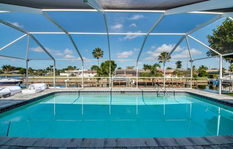 Intervillas Florida - Villa Serenity, Beautiful Villa rental in Cape Coral has 3 bedrooms, 2 bathrooms, 6 sleeps, 7 minimum stay Villa for rent in Cape Coral Florida with the amenities and near by attractions , Air Conditioning, Beach Chairs, Beach View, Dock/Boat Slip, Free WiFi, Full Kitchen, Garage, Heated Pool, Internet, Kayak / Canoe, Lake View, Lakefront, No Pets Allowed, Non-Smoking, Parking, Pool Table, Private Pool, Swimming pool, Towels Provided, Washing Machine, Waterfront, Wireless Internet, Cable/Satellite TV, Ceiling Fans, Clothes Dryer, Coffee Maker , Dishes & Utensils, Dishwasher, DVD Player, Freezer, Hair Dryer , Ice Maker, Iron & Board , Microwave, Outdoor Grill, Oven, Refrigerator, Telephone, Television, ToasterBilliard table, stereo system, CD player, Familyfriendly, luxury, Golf vacations, beach towels, gas grill, 6 garden chairs, garden, Covered seating area, 4 chairs, boat launch, motorboat, boat lift, Cutlery & glasses, Ceramic / ceramic hob, bed linen, Water cooler, safe, cooling box, Küchenbar, Seating for 6 persons