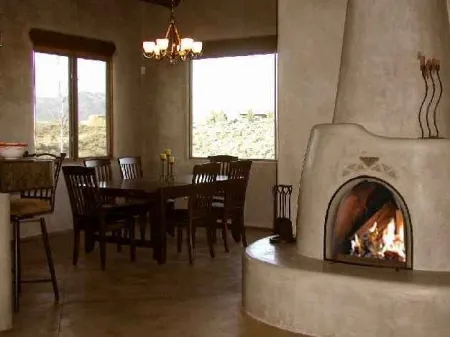 Amenities/features: large windows facing views; two kiva fireplaces, owner provides treated fire logs for your convenience, outside deck facing Taos Mountain and patio facing the lights of Taos, in the distance; Wi-Fi high-speed internet access, Satellite TV with DVD player; radio/CD/tape player; washer/dryer; shades to keep the sunrise out when you sleep late; telephone; beautiful walk of about three-quarters of a mile takes you to the end of the privately-maintained gravel road.