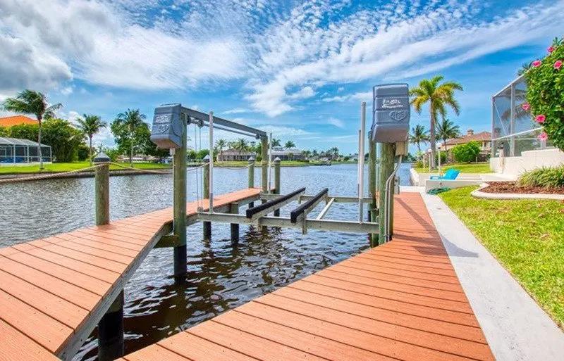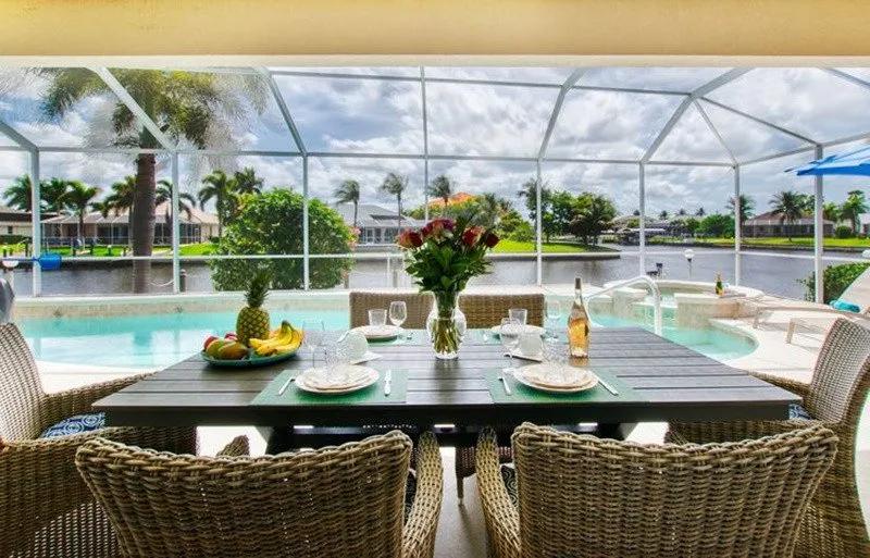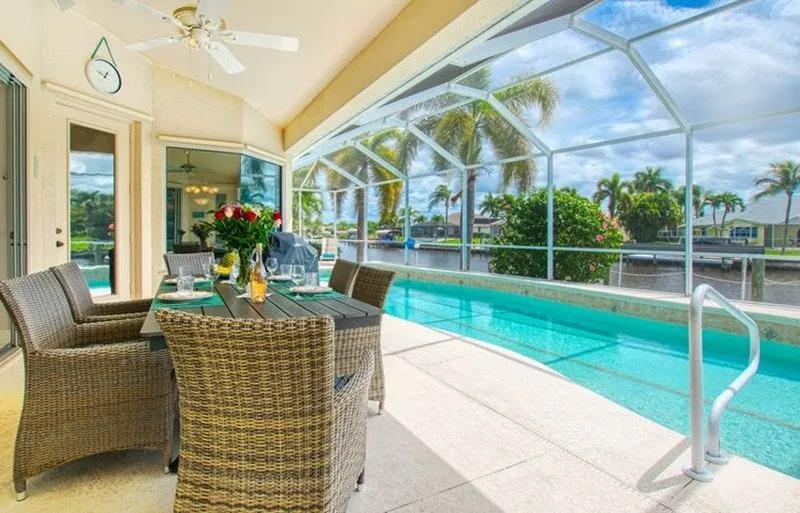 Intervillas Florida - Villa Esmeralda, Beautiful Villa rental in Cape Coral has 3 bedrooms, 3 bathrooms, 6 sleeps, 7 minimum stay Villa for rent in Cape Coral Florida with the amenities and near by attractions , Air Conditioning, Balcony, Beach Chairs, Bicycles, Dock/Boat Slip, Free WiFi, Full Kitchen, Garage, Heated Pool, Internet, Kayak / Canoe, Linens Provided, No Pets Allowed, Non-Smoking, Parking, Private Pool, Swimming pool, Towels Provided, Washing Machine, Wireless Internet, Blender, Cable/Satellite TV, Ceiling Fans, Clothes Dryer, Coffee Maker , Dishes & Utensils, Dishwasher, DVD Player, Freezer, Hair Dryer , Ice Maker, Iron & Board , Microwave, Outdoor Grill, Oven, Refrigerator, Stove, Telephone, Television, Toaster, Washer/Dryer Outdoor Whirlpool/Spa, Nespresso coffee machine, Swimming Pool, Whirlpool, Family friendly, Luxury Homes, Golf, Deck chairs, Beach towels, Garden, 6 Garden-Chairs, 6 Deck-Chair, Boat lift, Ceramic / ceramic hob, Tableware, High Chair, Kitchen bar, Seating for 6 people