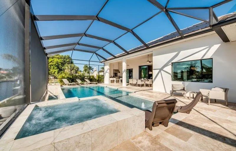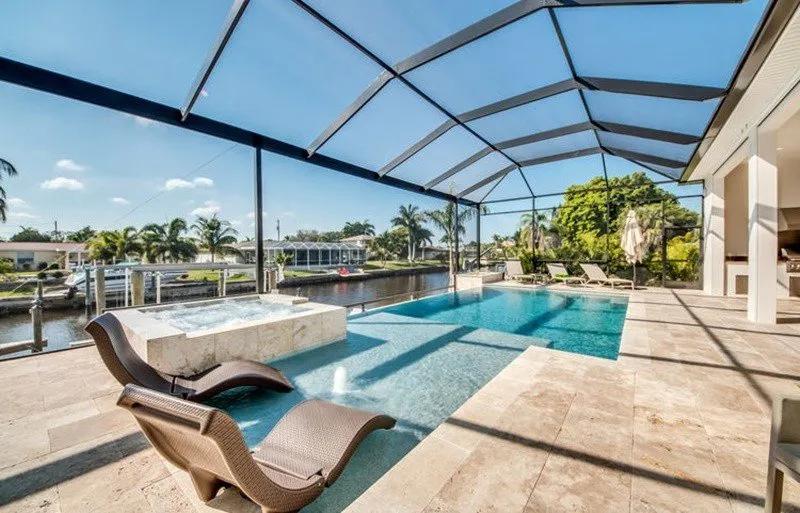 Intervillas Florida - Villa Montclaire, Beautiful Villa rental in Cape Coral has 4 bedrooms, 3 bathrooms, 8 sleeps, 7 minimum stay Villa for rent in Cape Coral Florida with the amenities and near by attractions , Air Conditioning, Dock/Boat Slip, Free WiFi, Full Kitchen, Garage, Heated Pool, Hot Tub, Internet, Lake View, No Pets Allowed, Non-Smoking, Parking, Private Pool, Swimming pool, Towels Provided, Washing Machine, Water View, Wireless Internet, Cable/Satellite TV, Ceiling Fans, Clothes Dryer, Coffee Maker , Dishes & Utensils, Dishwasher, Freezer, Hair Dryer , Ice Maker, Iron & Board , Microwave, Outdoor Grill, Oven, Refrigerator, Television, Toasterspa, CD player, stereo system, whirlpool, Familyfriendly, luxury, Golf vacations, 8 garden chairs, garden, Covered seating area, 8 chairs, boat launch, motorboat, boat lift, Cutlery & glasses, Ceramic / ceramic hob, bed linen, Water cooler, cooling box, Küchenbar, Seating for 8 people