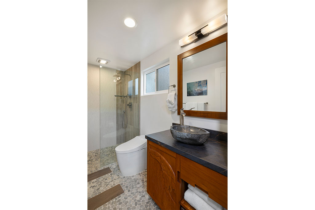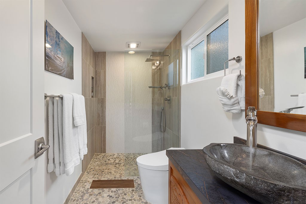 Modern Asia meets Bali in the home's powder room! Unveiled as you enter is a hand carved Indonesian teak vanity with an artist's rendition of the World Famous Pipeline and a top of the line Japanese Toto fully automatic washlet! Refresh yourself with the stone vessel sink and waterfall faucet. Pebble stone flooring with porcelain stepping stones through the bath makes you feel like you never left the beach along with the waterfall shower tile and rain shower head. Reinvigorate yourself with Giovanni Eco Chic Tea Tree Shampoo/Conditioner and Body Wash before you head out to dinner to celebrate!