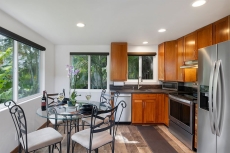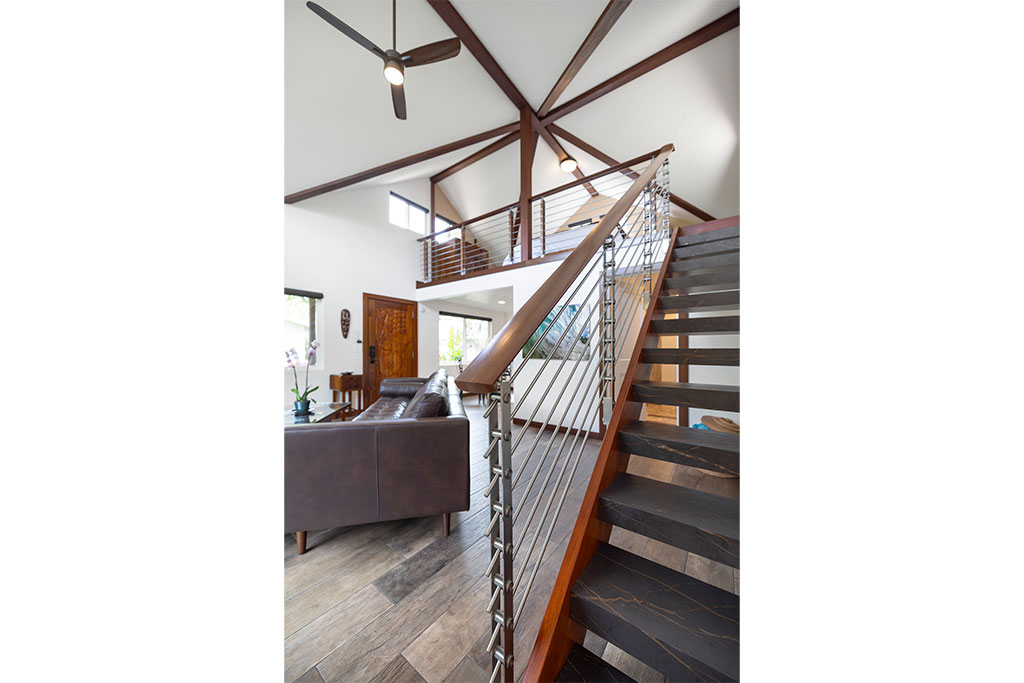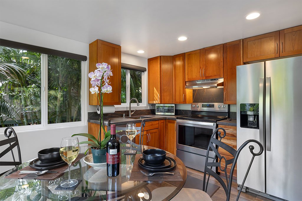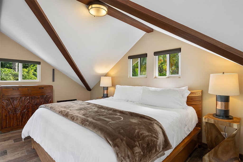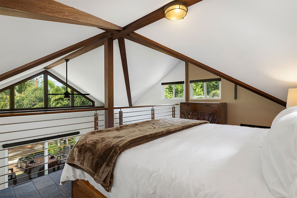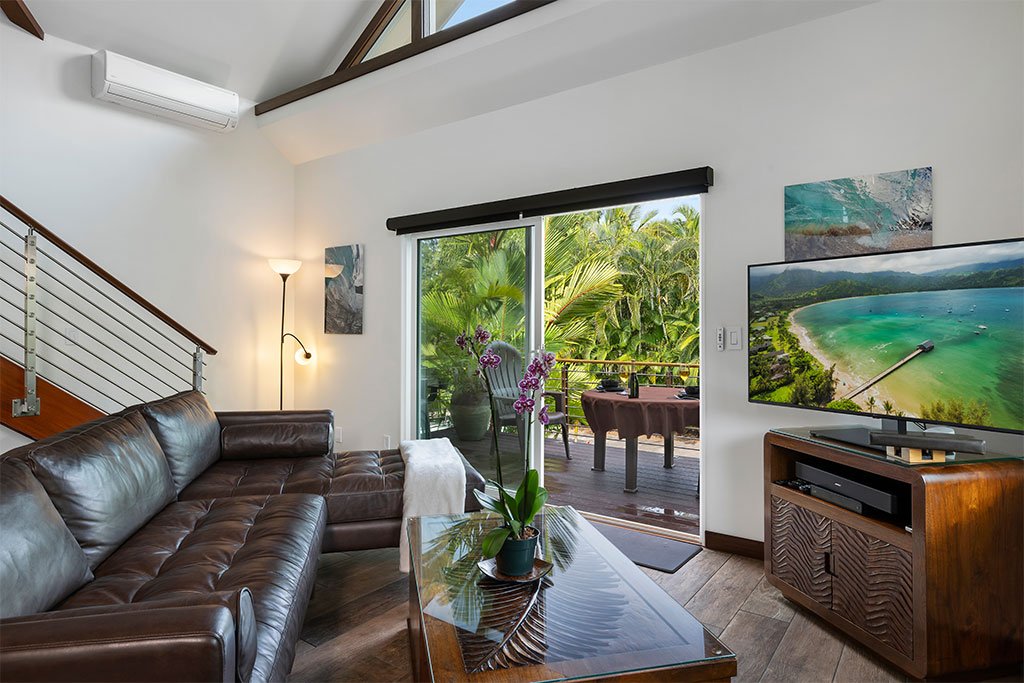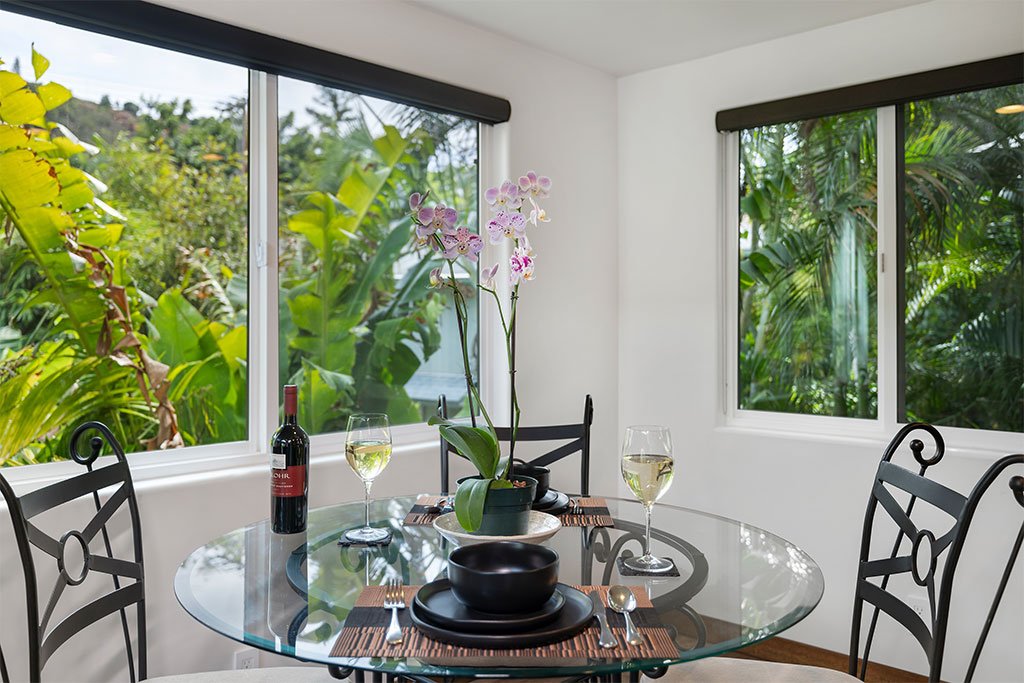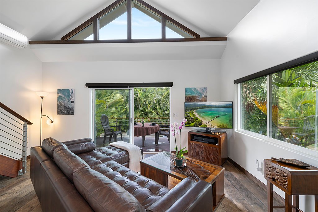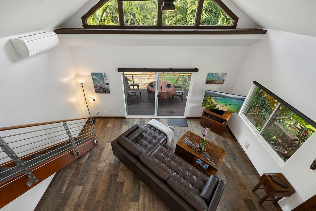As you kick back and relax, porcelain flooring from Sassuolo Italy along with large contemporary metal art images of Ke Iki Beach Shorebreak encompass the home! Large windows throughout the cottage bring in natural light on the first floor. Each window is surrounded with exotic palms, bamboo, and tropical plants offering privacy from surrounding neighbors and a perfect setting for breakfast in the morning while the sun rises.
