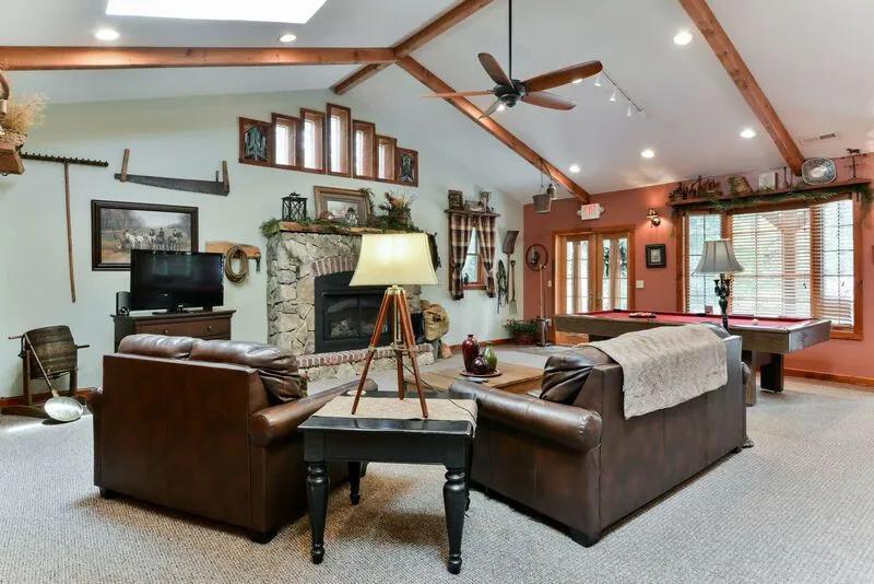 The Hiding Place - All-One-Level Carriage House - Pool Table, Hot Tub, Beautiful House rental in Missouri has 2 bedrooms, 2 bathrooms, 7 sleeps, 2 minimum stay House for rent in Missouri United States of America with the amenities and near by attractions , Air Conditioning, Carbon-monoxide detector, Fireplace, Heating, Internet, Kitchen, No Smoking, Non-Smoking, Parking, Smoke detector, Washing Machine, Wireless Internet, Basic Soaps, Blender, Cable/Satellite TV, Ceiling Fans, Clothes Dryer, Coffee Grinder, Coffee Maker , Dining Area, Dishes & Utensils, Dishwasher, DVD Player, First-aid kit, Freezer, Hair Dryer , Hangers, Heater, Ice Maker, Iron & Board , Kettle, Living Room, Microwave, Outdoor Grill, Oven, Refrigerator, Shampoo, Stove, Telephone, Television, Toaster, Toilet Paper, Washer/Dryer