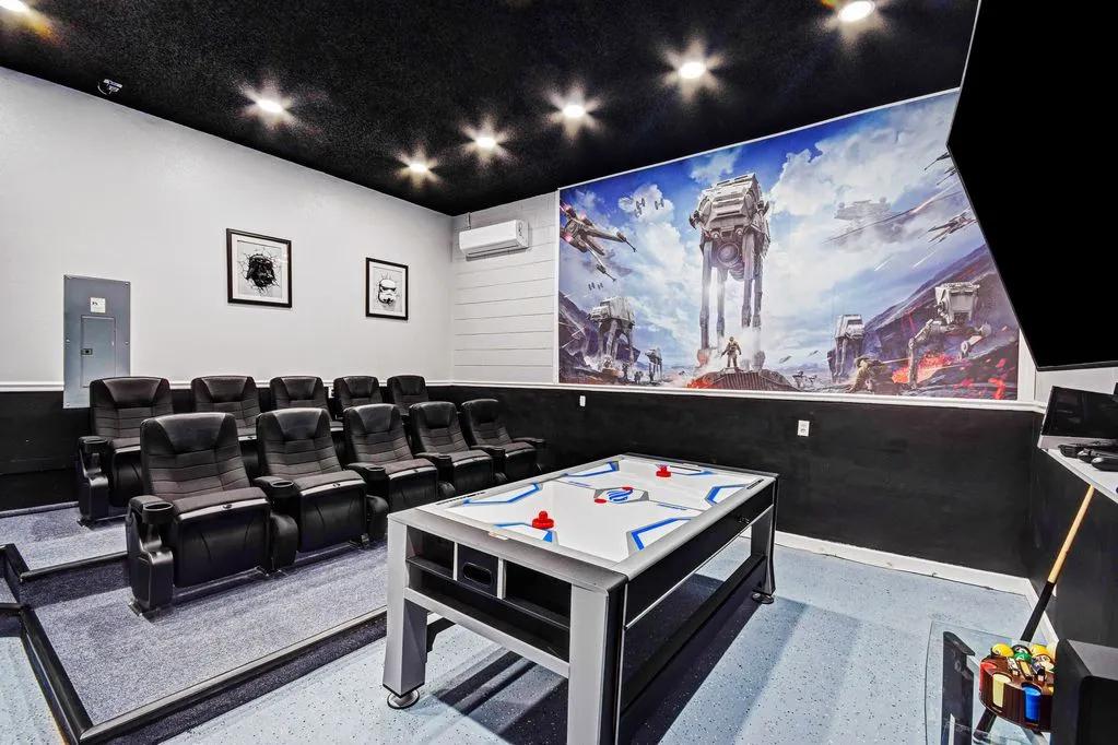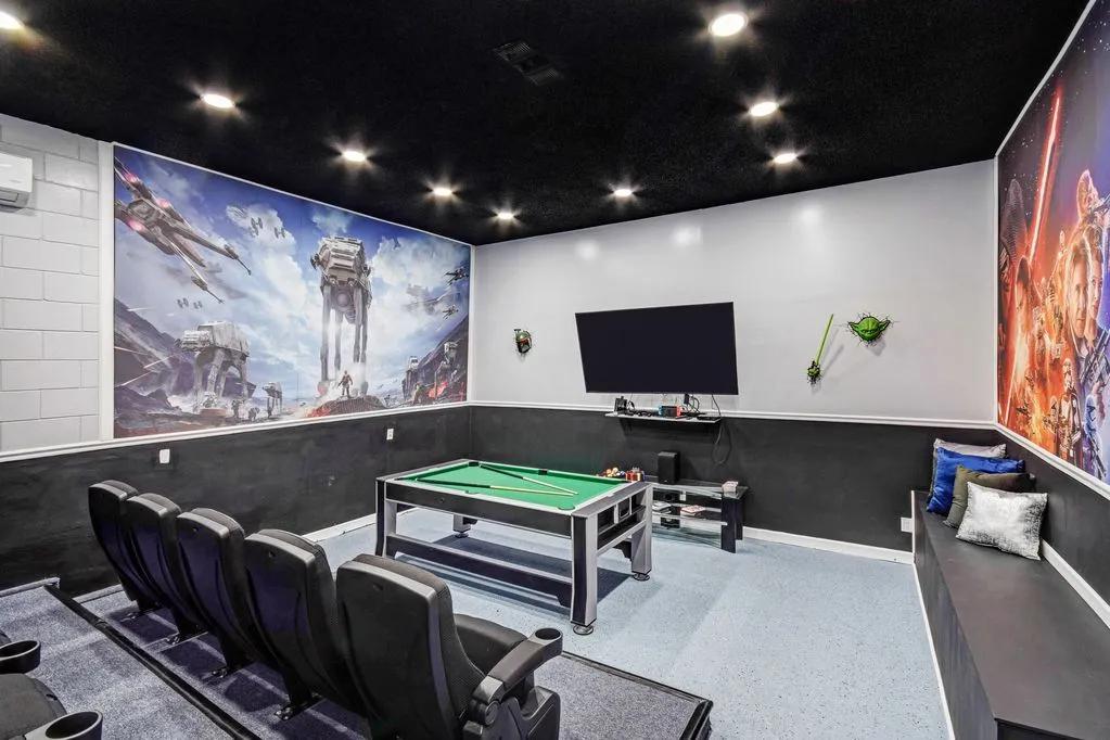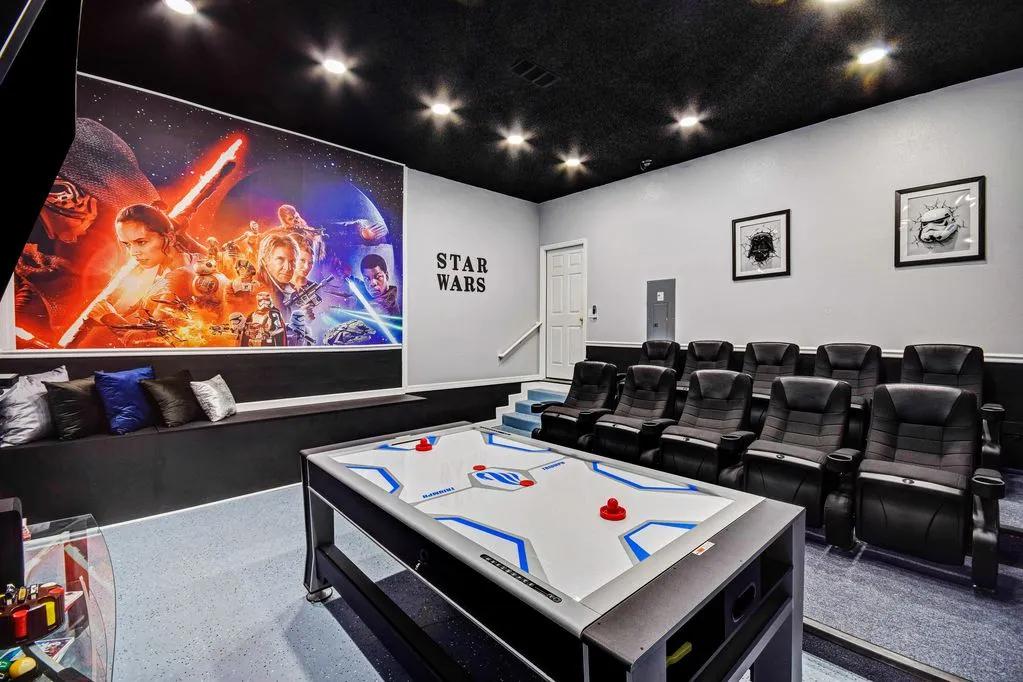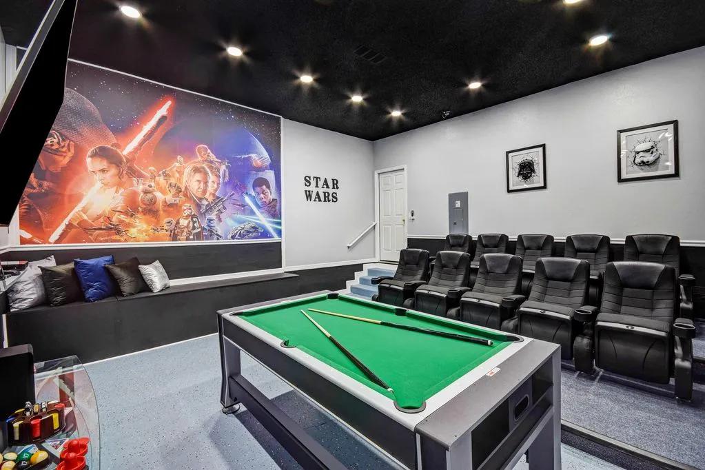 Knight Castle - Disney Themed Estate|Pool +Spa|Movie & Game Room, Beautiful House rental in Disney Area has 7 bedrooms, 4 bathrooms, 16 sleeps, 2 minimum stay House for rent in Disney Area Florida with the amenities and near by attractions , Air Conditioning, Carbon-monoxide detector, Children Welcome, Communal Pool, Exterior lighting, Fire extinguisher, Fitness Room , Garage, Heated Pool, Heating, Hot Tub, Internet, Kitchen, Kitchenette, Linens Provided, No Smoking, Parking, Ping Pong Table, Pool Table, Private Pool, Smoke detector, Swimming pool, Towels Provided, Washing Machine, Wireless Internet, Basic Soaps, Blender, Cable/Satellite TV, Clothes Dryer, Coffee Maker , Dining Area, Dishes & Utensils, Dishwasher, DVD Player, Hair Dryer , Heater, Ice Maker, Iron & Board , Living Room, Microwave, Outdoor Grill, Oven, Television, Toaster, Washer/Dryer Deadbolt lock, resort, Kitchen roll, Toilet roll, Fridge, Hob, Pantry items, Stereo, Games room, Games for kids, Video library, Video games, Garden, Beach towels, Veranda, Terrace, Outdoor Furniture, Golf, Long-term renters welcome, Outdoor pool, Sauna, Spa whirlpool, Pool, Housekeeper optional