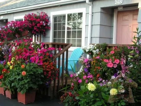 Featured on Great Escapes, Travel Channel and Style Network. Award winning flower displays. Deluxe 1 BR Suites for 2 adults (no children, full kitchen, dining room, living room, bedroom (queen bed), bath with shower or jetted tub with shower, deck in front. Luxury bath amenities, robes, slippers. Complimentary coffee, tea, cocoa, popcorn, cookies, candy and more... all restocked daily with maid service. Suites are within a few short blocks of Broadway St. and beach. Walk to everything!
