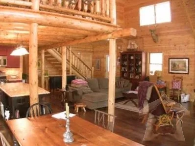 Riverfront log Holiday Rental Travel Home on 10 acres. Just built 6 bedroom plus loft, 2 baths, features cathedral ceilings, massive stone (wood burning) fireplace, modern fully equipped kitchen & nicely furnished. The unfinished lower level offers a hockey table, basketball game & eliptical excercise machine plus french doors that open out to the river with 550 feet of river frontage. Enjoy floating on the river from the tubes and a raft that are available to tenants. Sleeps 14.