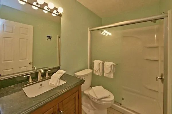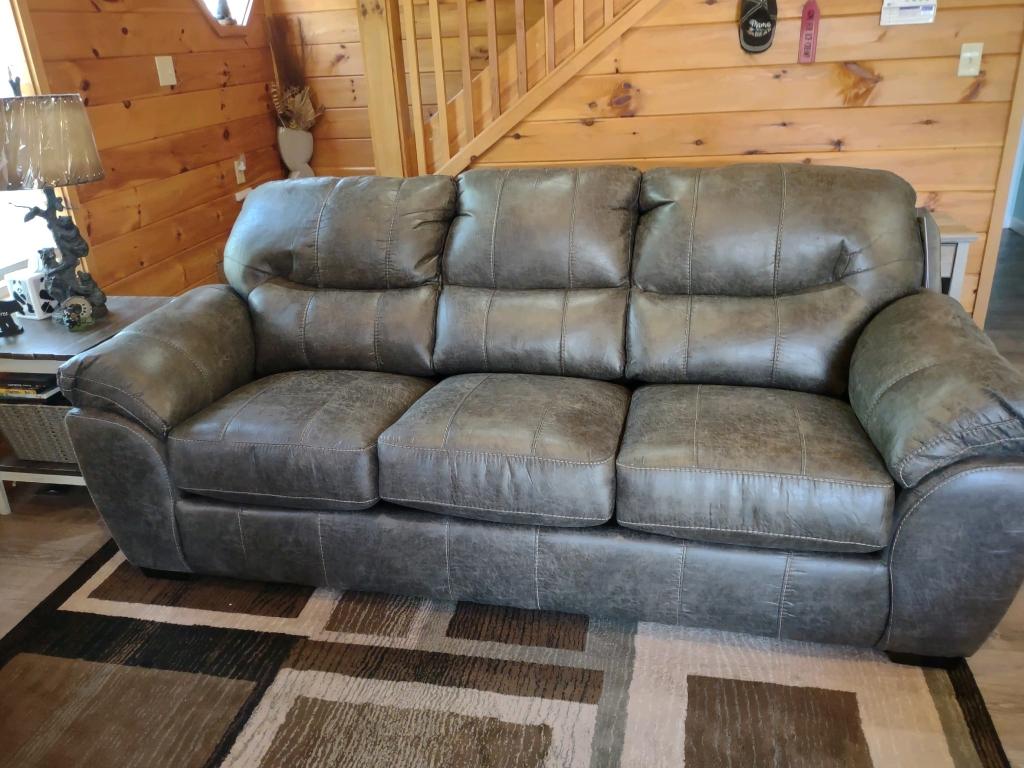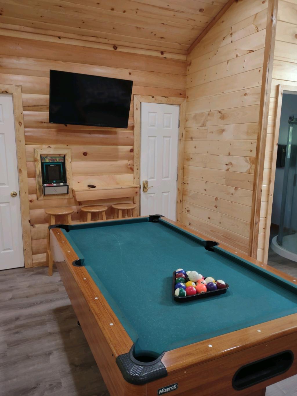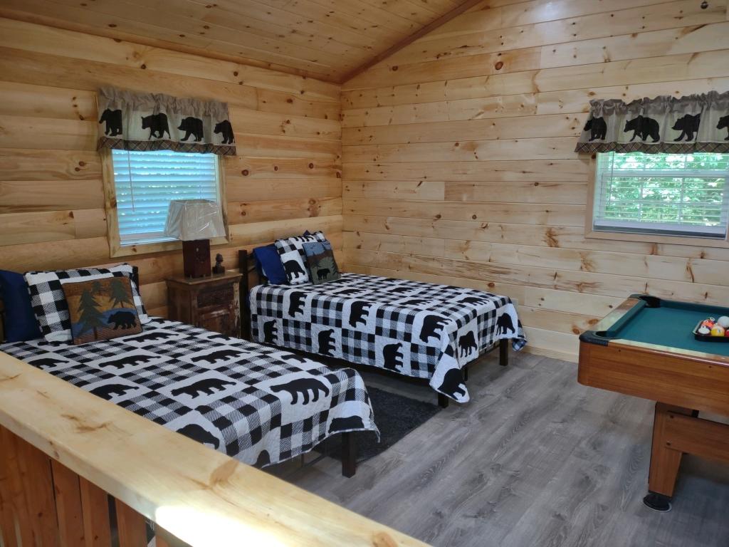 The cabin includes one king size bed, one queen size bed. There is one bathroom with a standing shower, one hot tub, and gas fireplace. DO NOT PUT ANY REAL WOOD LOGS IN THE FIREPLACE. IT WILL BURN DOWN THE CABIN.