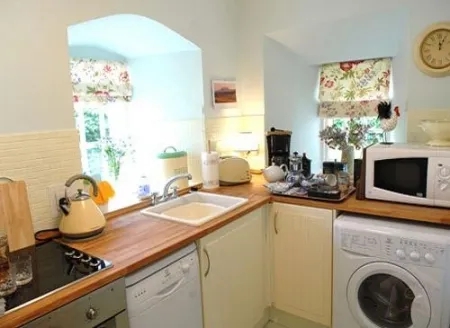 Tiled floor, porcelain 'Belfast' sink and wooden worktops, two deep-recessed country cottage-style windows, fridge, freezer, microwave, hob, oven, dishwasher, clothes washer/dryer, coffee-maker and all the modern utensils you will require.