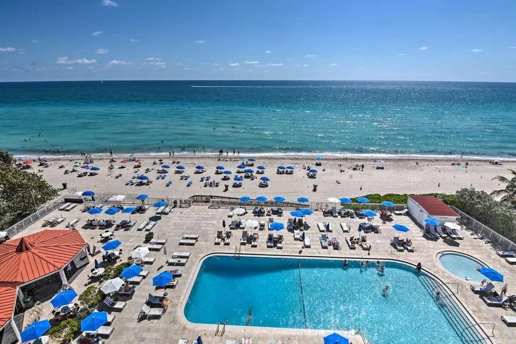 1 Insta-Worthy. Ocean Front-Best Corner unit in building. Everything is Luxurious, Beautiful Studio rental in Sunny Isles Beach has 1 bedrooms, 1 bathrooms, 6 sleeps, 10 minimum stay Studio for rent in Sunny Isles Beach Florida with the amenities and near by attractions , Air Conditioning, Balcony, Paper Towels, Beach View, Communal Pool, Elevator, Fitness Room , Free WiFi, Heated Pool, Heating, Internet, Kid Friendly, Kitchenette, Linens Provided, Managed by Owner, No Pets Allowed, Ocean View, Oceanfront, Outdoor Shower, Parking, Ping Pong Table, Towels Provided, Water View, Waterfront, Wireless Internet, Kitchen, Children Welcome, Swimming pool, Children allowed, No Smoking, No parties/events, Beachfront, Smoke detector, Blender, Microwave, Cable/Satellite TV, Television, Freezer, Toaster, Coffee Maker , Hair Dryer , Refrigerator, Dishes & Utensils, Iron & Board , Heater, Ice Maker, Dining Area, Basic Soaps, Toilet Paper, Kettle, HangersGames for Kids, Dishes & utensils, Dining table, Outdoor Pool, Smart TV, Coin laundry, Parking Valet fee 10 days or more is $10.00 a day if paid up front If less than 10 days its $ 20.00 a day and can be paid daily or in advance Monthly fee paid to Sunny Isles of $ 50.00 a month with Resort ID, Beach, Minimum Age Limit for Renters 21, Tiki Hut for beverages and foods, Italian Restaurant Downstairs in the lower lobby. Long-term Renters Welcome