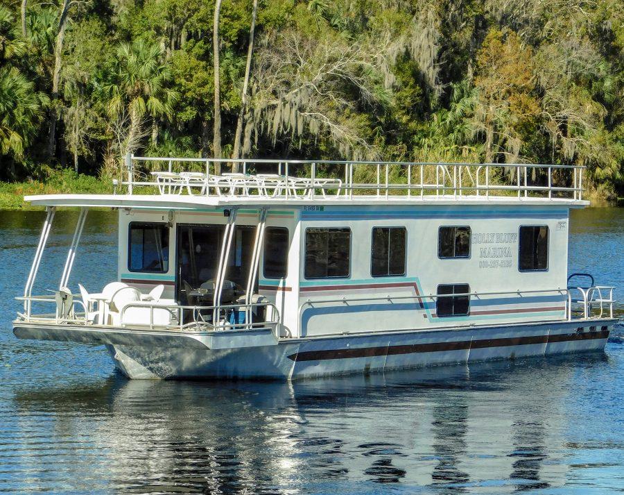 Holly Bluff Marina offers houseboat rentals on the beautiful St. Johns River in Central Florida. The St. Johns River offers mile after mile of breathtaking view and pristine beauty. Spanish Moss draped trees line the banks of the river and the many lakes that dot the northerly course of the river. There is an abundance of wildlife: alligators, turtles, otter, deer, and raccoon. You may even see manatee (sea cows) grazing on the grasses along the river's shore. The natural lush landscape is home to a great variety of exotic birds such as the blue heron, osprey, eagles, hawks and owls. Relax and see the wonders of Florida's back country from the deck of one of our luxurious houseboats. See live alligators basking in the sun in their natural habitat. Explore our warm water springs where the endangered manatee spend winters in the crystal clear 72 degree water.