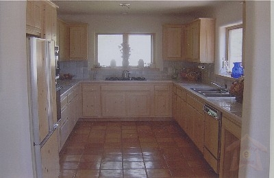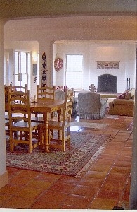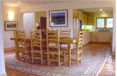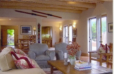 The living room has an adobe fireplace as well as an entertainment center with satellite TV, stereo, and DVD. The couch is a king-size sleeper sofa. Radiant heated floors throughout the house make walking barefoot a pleasure. The house features numerous custom touches such as limestone windowsills, skylights and ceiling fans in each bedroom.