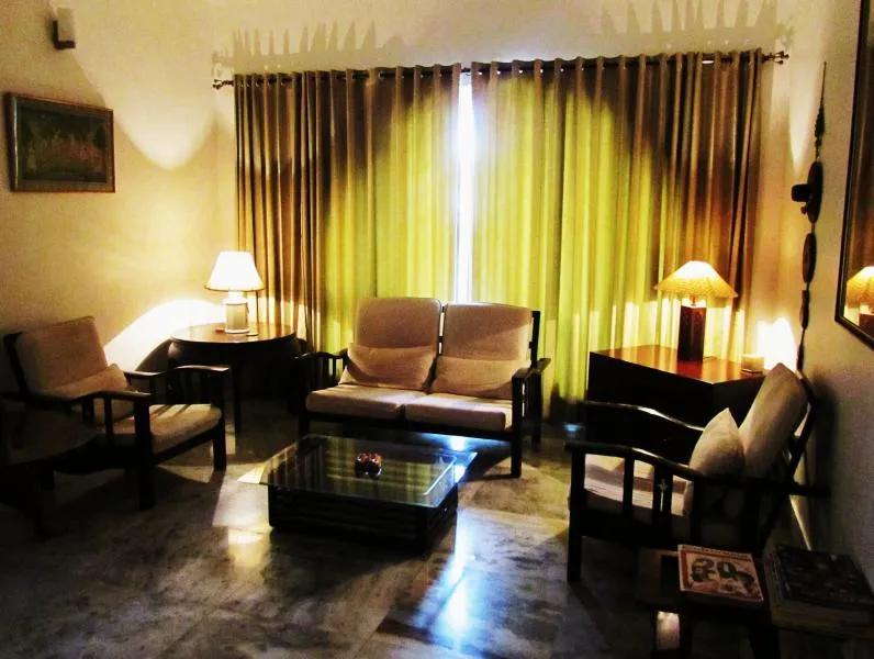 accommodation , bright and neutrally colored, has all the modern facilities and amenities: Bedrooms are tastefully furnished with attached modern bathrooms, Living room has STD/ISD enabled telephone, broadband connection, TV, DVD, Kitchen is fully equipped-Microwave oven, Fridge, Gas range, Crockery/Cutlery All the areas are tastefully decorated with wall paintings, door/window drapes, 24 hours hot/cold water supply. Secure four wheeler parking space at no extra cost Personalized house keeping services daily at no extra cost, bedding & linen serviced, In-house laundry. Open to the sky roof top terrace, ideal for sun bathing and cozy get-togethers. Step into our serviced residence a unit of at_home hospitality services and the first thing that will please you is the generosity of space. It is a duplex residence and each floor is spread over an area of 1200 sq ft. The GROUND FLOOR of the residence has a very spacious living room equipped with comfortable couches, divan with cushioned bolsters, TV with 80 channels, VCD/DVD player, Telephone with STD/ISD dialing facility The living room leads to a well appointed very roomy bedroom - EXECUTIVE which has well cushioned mattresses, individual reading lamps, large built-in wardrobes, dressing table, ceiling fan.