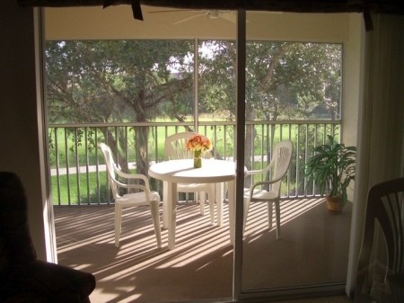 The condo has an eat-in kitchen, dining room, living room, master bedroom with king-size bed, second bedroom with 2 twin beds, 2 bathrooms, vanity/dressing area, walk-in closet and screened in lanai with a wonderful view over the golf course.