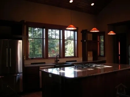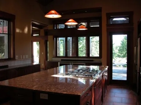 This beautiful Timber Frame Accent Holiday Travel House Rental has an open floor plan for entertaining. The client has taken advantage of our services through our Design Center and we have designed the kitchen using Cherry Cabinets from Wellborn and a Copper Farmhouse sink from Native Trails. It has a warm inviting interior that is so welcoming.