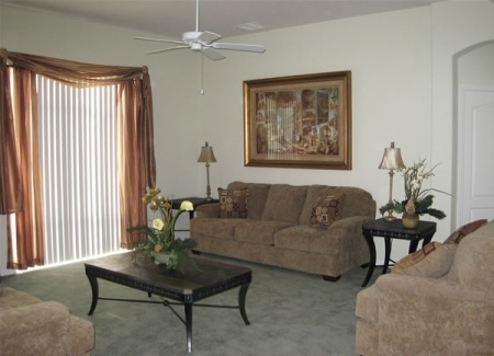 Family Room: The fabulous family room is the hub of the vacation home. Decorated in subtle shades of green, and featuring wonderfully comfortable seating. Your family and friends can "recharge their batteries" and prepare for the next day's activities, while taking in a film from the available DVD collection.