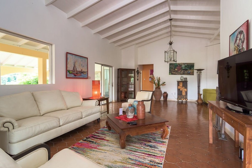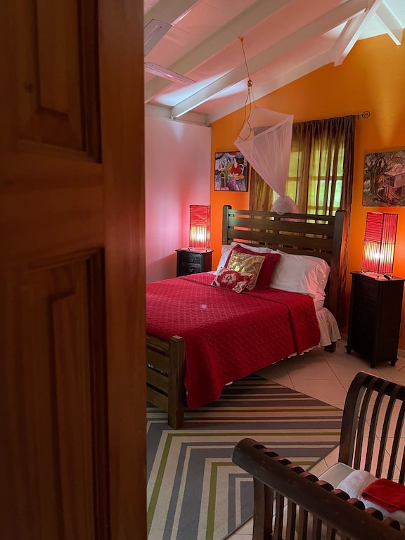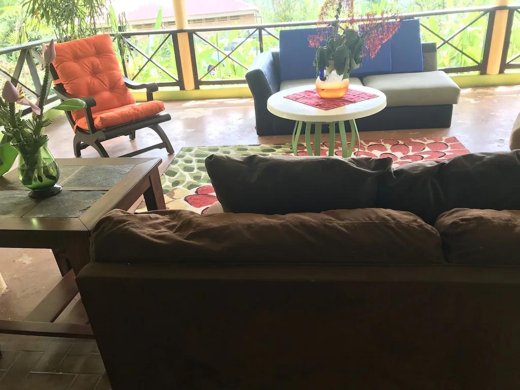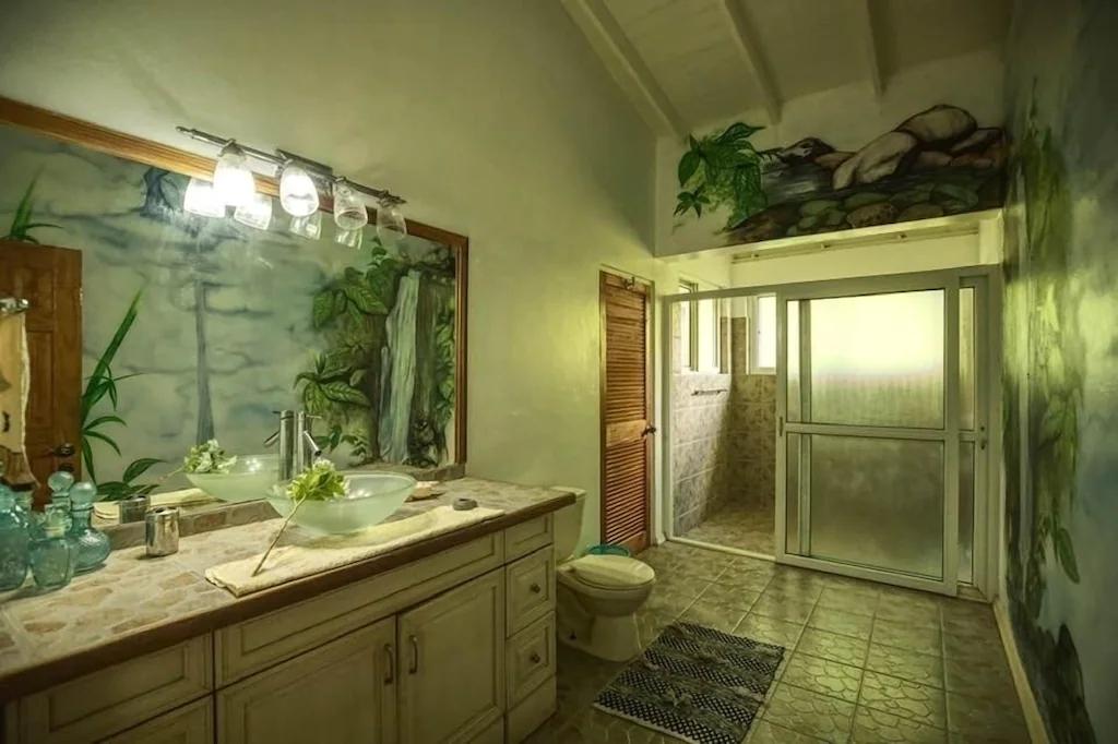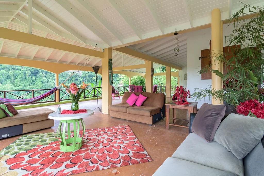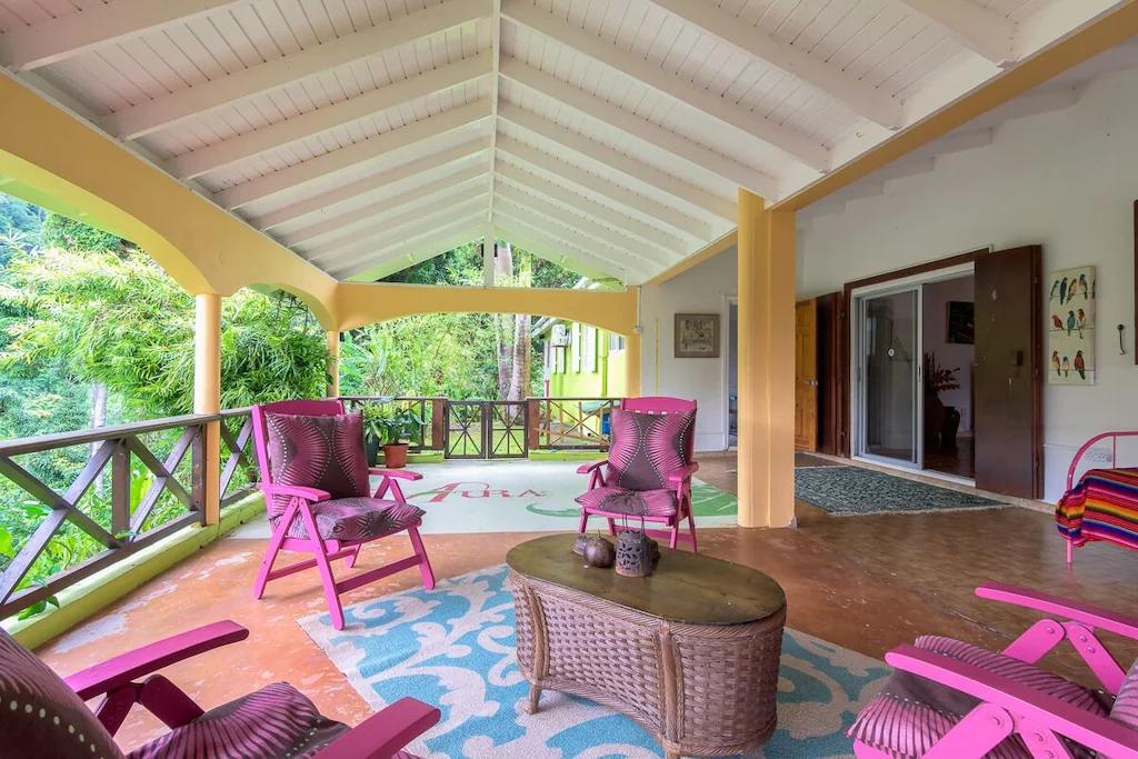 A stunning three (3) bedroom Villa in the middle of heavens nature, Beautiful House rental in Dominica has 3 bedrooms, 2 bathrooms, 8 sleeps, 1 minimum stay House for rent in Dominica Caribbean with the amenities and near by attractions , Air Conditioning, Balcony, Children Welcome, Exterior lighting, Internet, Kitchen, Linens Provided, Mountain View, No Pets Allowed, Paper Towels, Parking, Porch / Veranda, Towels Provided, Washing Machine, Wireless Internet, Basic Soaps, Blender, Cable/Satellite TV, Coffee Maker , Dining Area, Dishes & Utensils, First-aid kit, Ice Maker, Iron & Board , Kettle, Living Room, Microwave, Oven, Refrigerator, Stove, Television, Toaster, Toilet PaperLawn/Garden, Outdoor Furniture, Beach Towels, Emergency exit route, River, Housekeeper Optional, Massage, Car Available, Concierge, Private Chef, Chauffeur, Booking Possible, Minimum Age Limit for Renters 18, Long-term Renters Welcome, Smoking allowed: outside(Only in the balconies)