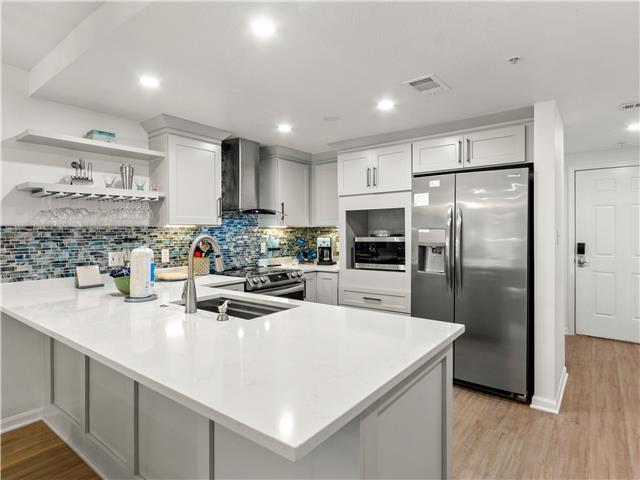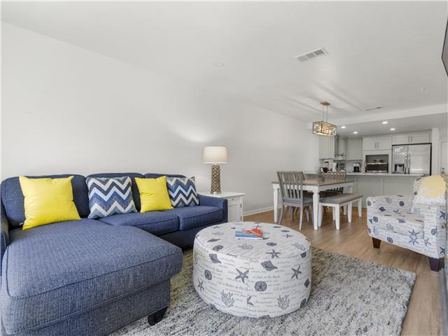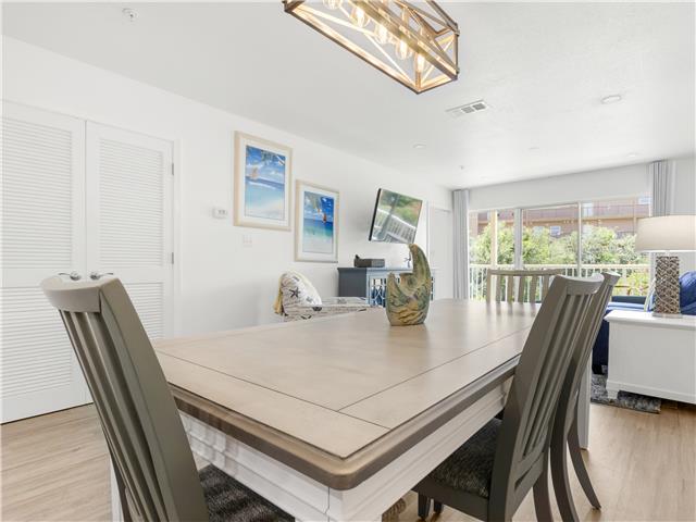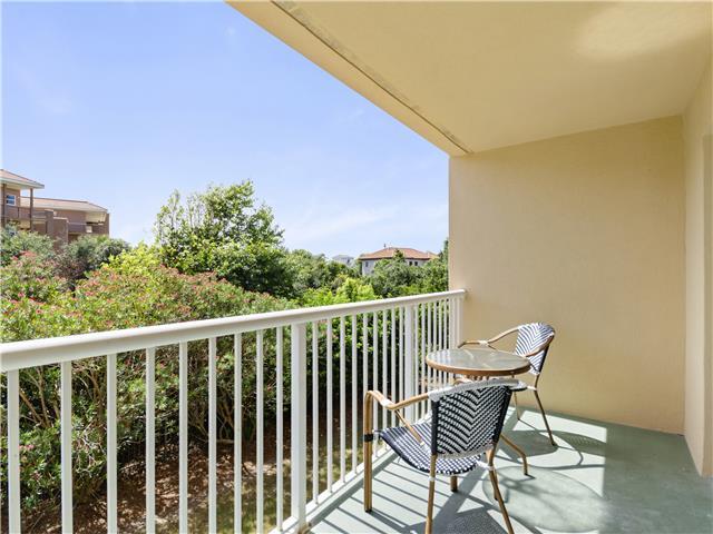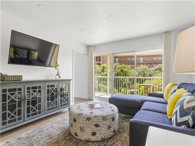 The living room offers a queen sleeper sofa and opens up to a large balcony overlooking lush landscaping. There is a fully stocked kitchen breakfast bar and dining room space for you to enjoy your home-cooked meals.