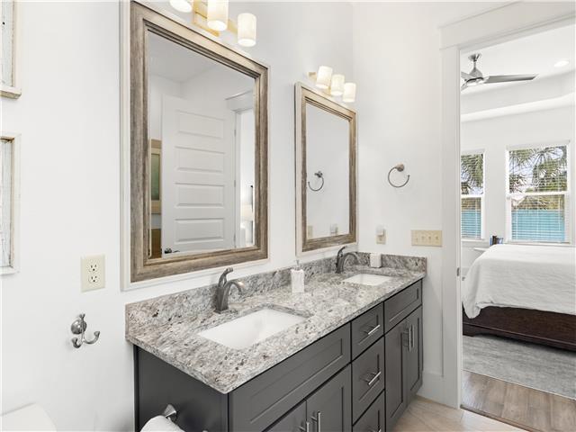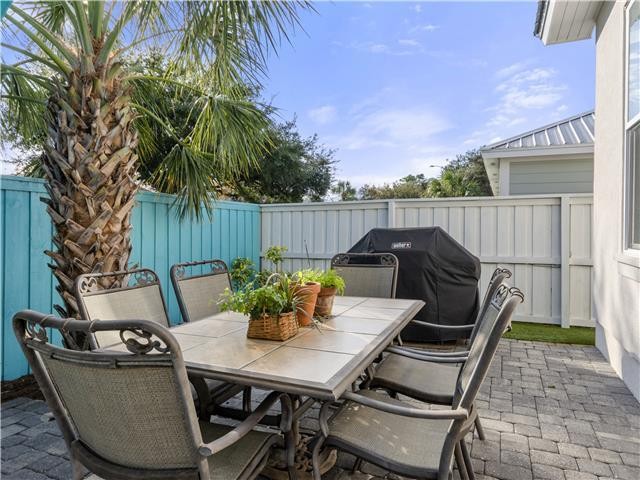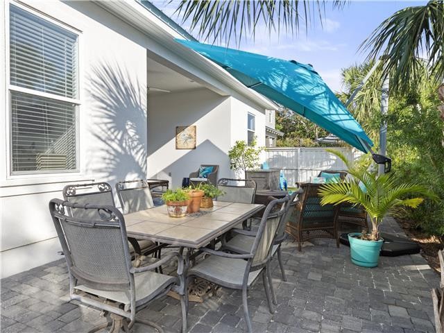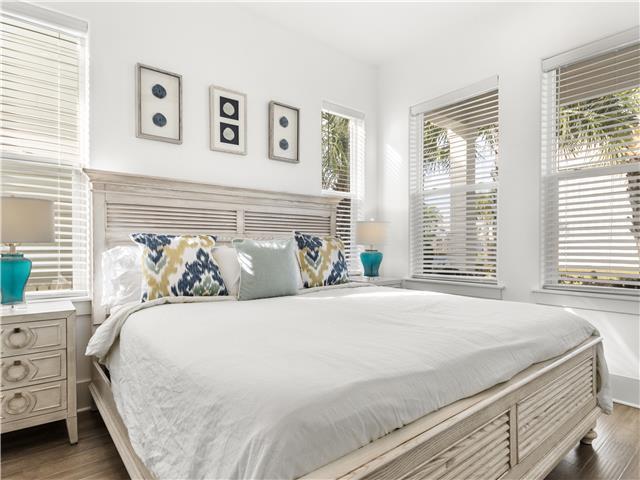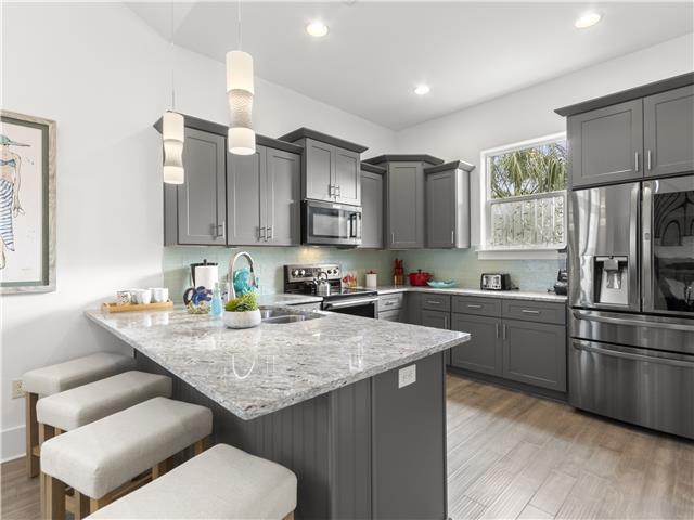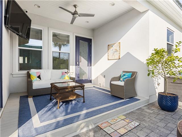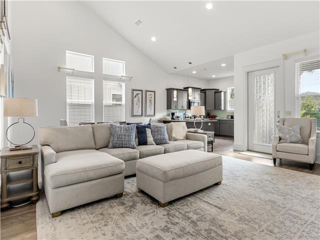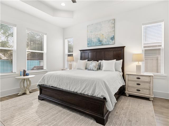 Whispering Palms is located in the gated South Walton community of Frangista Beach. This beautifully landscaped and well-maintained home offers 4 bedrooms and 3.5 baths. Some of the interior features include a tall vaulted ceiling in the living room offering an abundance of natural light, engineered wood floors, kitchen with black stainless steel appliances and attractive backsplash. The downstairs master suite has tray ceiling and walk-in closet. The huge upstairs suite has an en-suite bath and front patio overlooking the community. The exterior offers a huge back pavered and tiled back porch with a 52″ Smart TV, propane firepit, artificial turf grass on the back sides, privacy fenced back yard, metal roof, palm trees, and low-voltage landscape lighting.