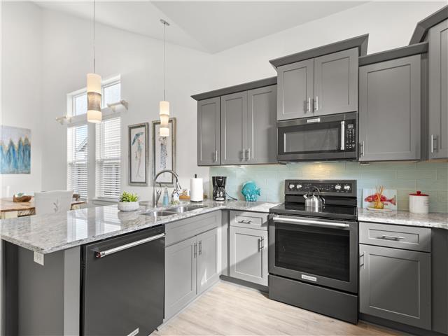 KITCHEN – FULLY FURNISHED: New appliances, full size refrigerator, gas stove/oven, microwave, counter-top small appliances, drip coffee pot, toaster, blender, crock pot), silverware/knives, pots/pans & baking sheets/pans. Everything you need to cook fabulous meals and enjoy privacy in your home away from home.