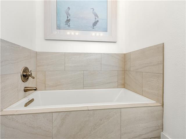 MASTER BEDROOM: Large bedroom with king bed, 42” flat screen Smart TV with upgraded on demand cable package, dresser, nightstands, and ceiling fan. There is a private en-suite bath with his and hers vanity, jet tub, and walk-in shower. The floor plan boasts a split bedroom design for plenty of privacy.