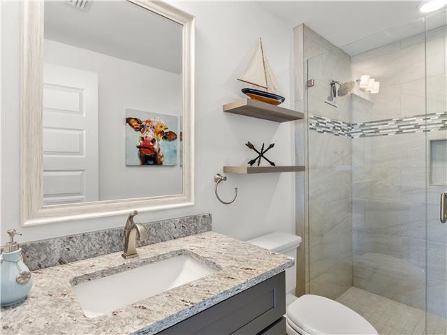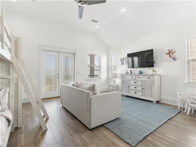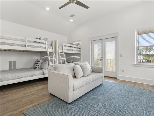 BEDROOM #4: Separate upstairs suite with two full bunks, sleeper sofa, an en-suite full bath with walk-in shower, and 55” Smart TV. Great getaway for the kids.