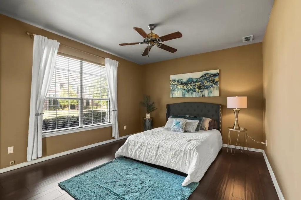 4 bd sleeps 10 /Theatre/Bar/ Spa bath/great loc, Beautiful House rental in Texas has 4 bedrooms, 2.5 bathrooms, 10 sleeps, 3 minimum stay House for rent in Texas United States of America with the amenities and near by attractions , Air Conditioning, Free WiFi, Kitchen, Parking, Smoke detector, Towels Provided, Basic Soaps, Dishes & Utensils, Hangers, Iron & Board , Outdoor Grill, Refrigerator, Toilet Paper121" HDTV with Netflix, Roku, Free washer – In unit, Hot water, Dryer, bed sheets, Bed linen, Extra pillows and blankets, Indoor fireplace: gas, Heating, First aid kit, Private patio or balcony, Garden, Fire pit, Outdoor furniture, Outdoor dining area, Self check-in, Keypad, Long-term stays allowed