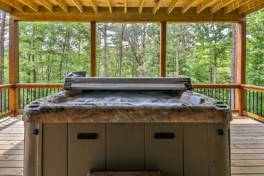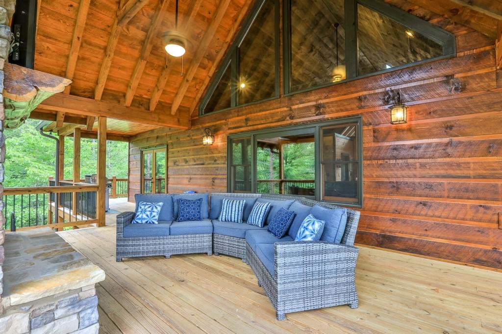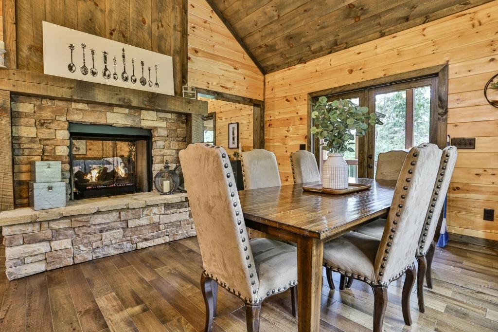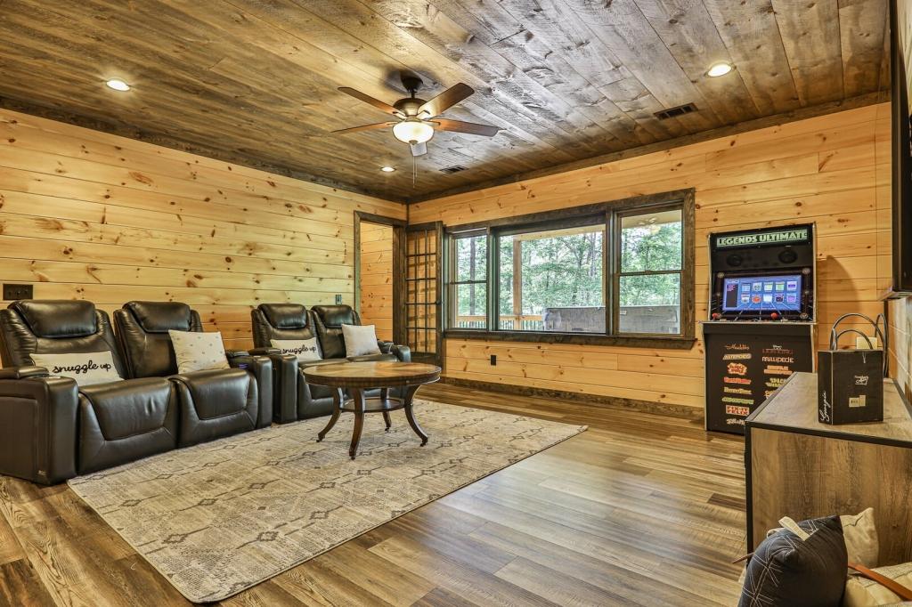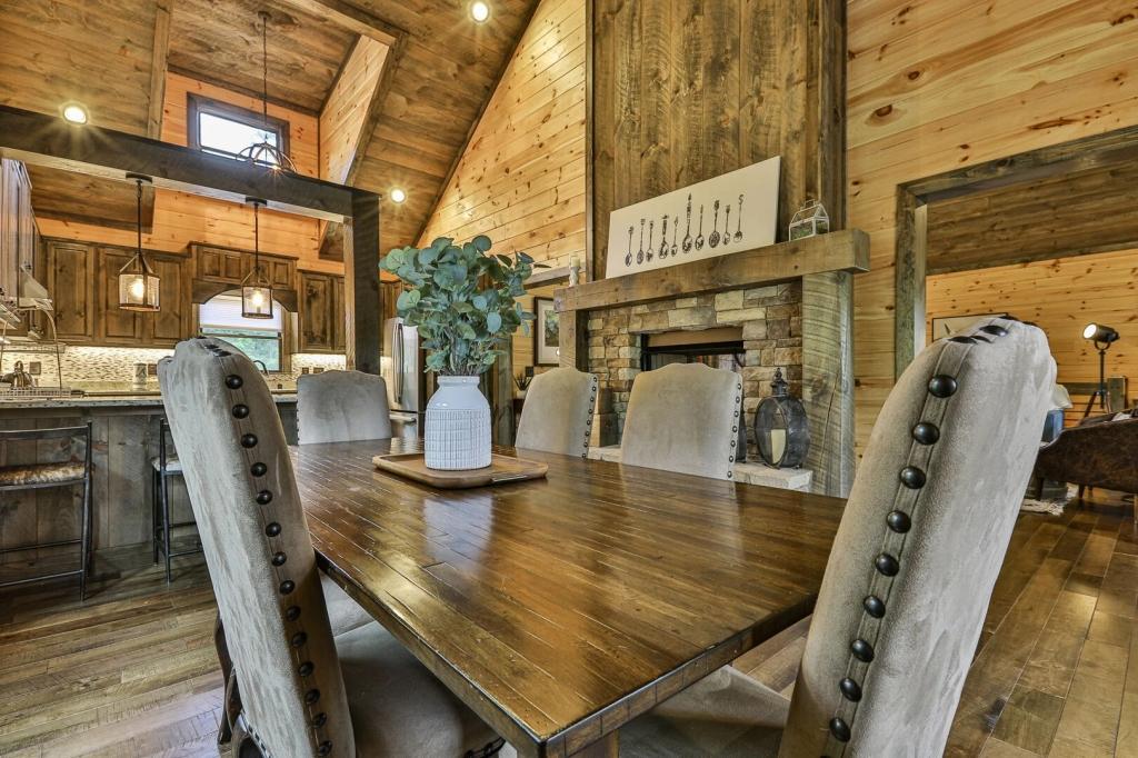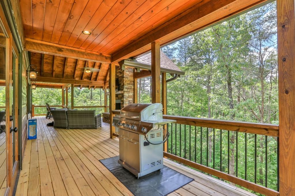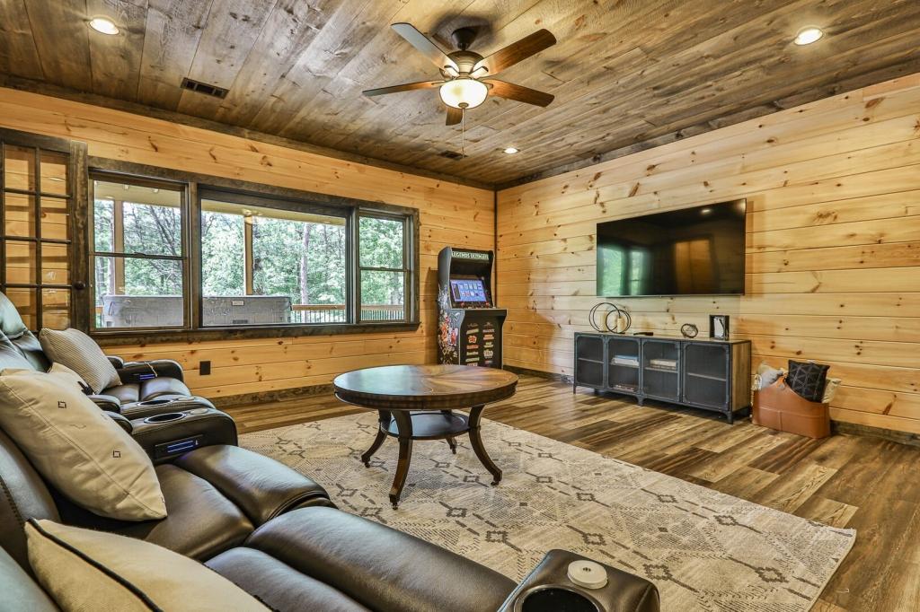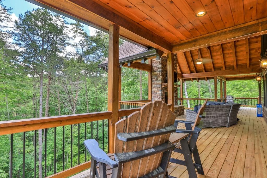 Highlands Retreat, Beautiful Cabin rental in Mineral Bluff has 3 bedrooms, 3 bathrooms, 6 sleeps, 2 minimum stay Cabin for rent in Mineral Bluff Georgia with the amenities and near by attractions , Deck/Patio, Fireplace, Game Room, Hot Tub, Kitchen, Parking, Porch / Veranda, Basic Soaps, Dining Area, Dishwasher, Living Room, Outdoor Grill, Refrigerator, Television, Toilet Paper, Washer/Dryer Back deck, Theater chairs, Decorated dining area