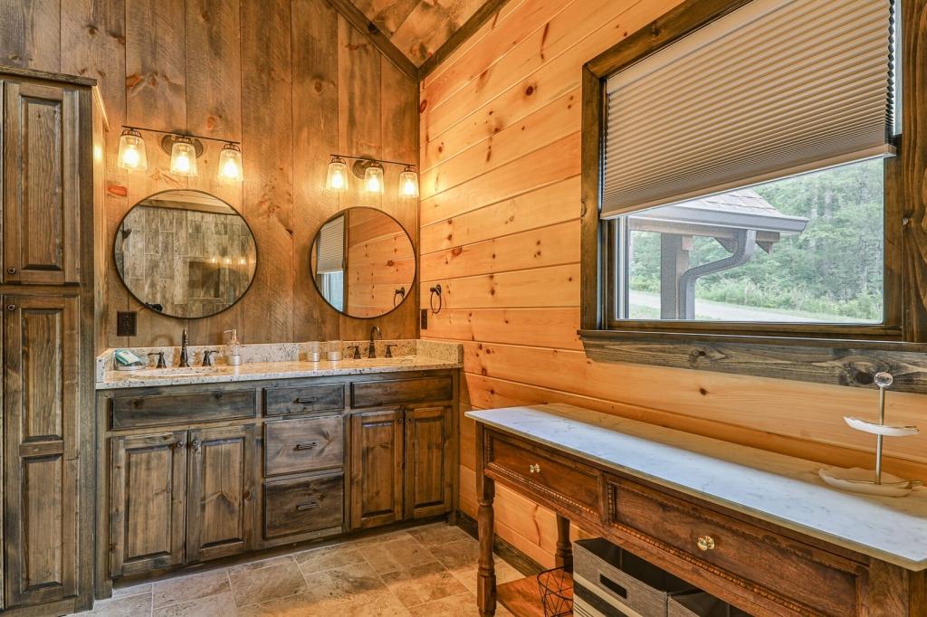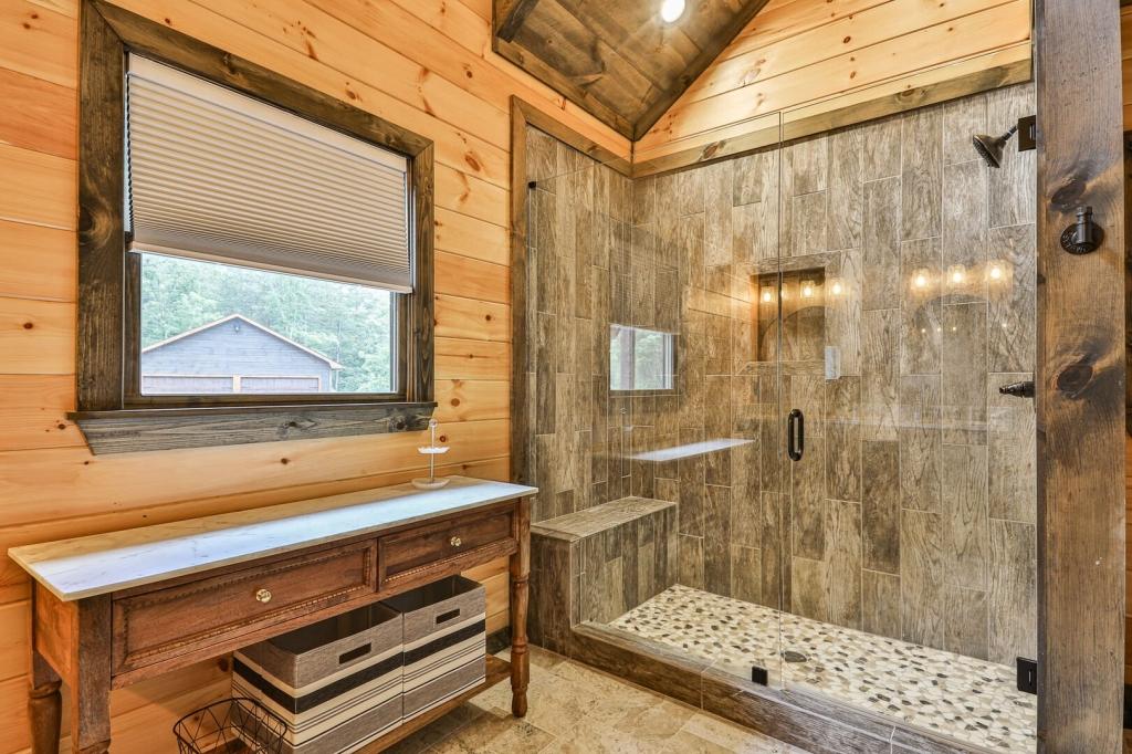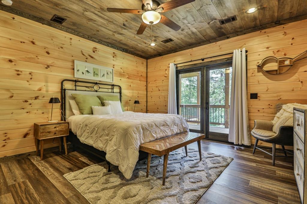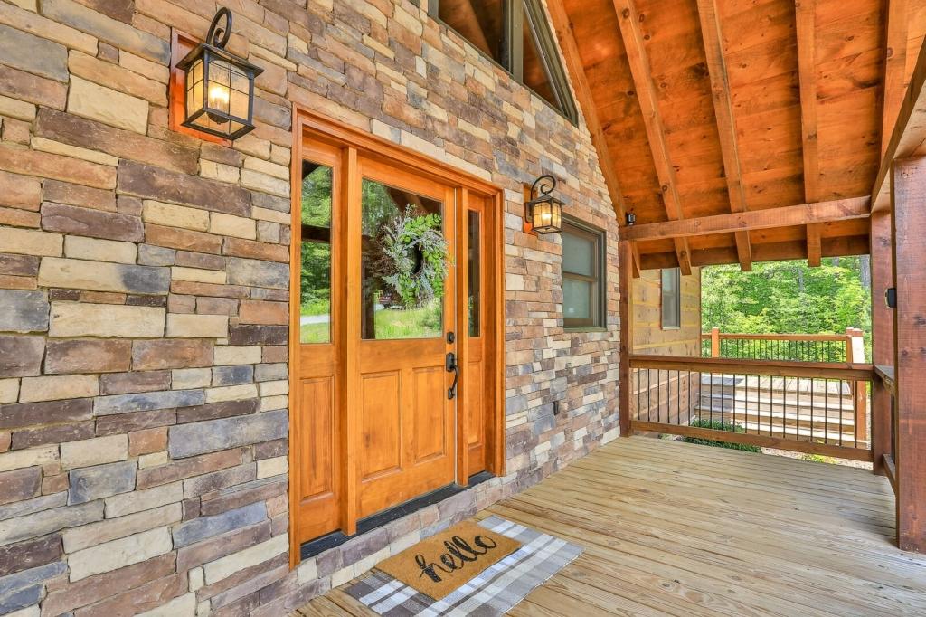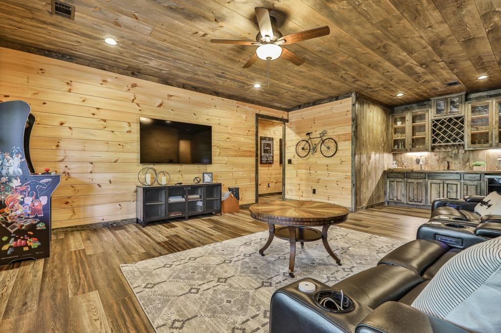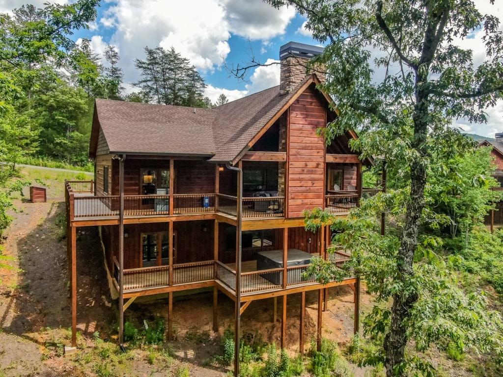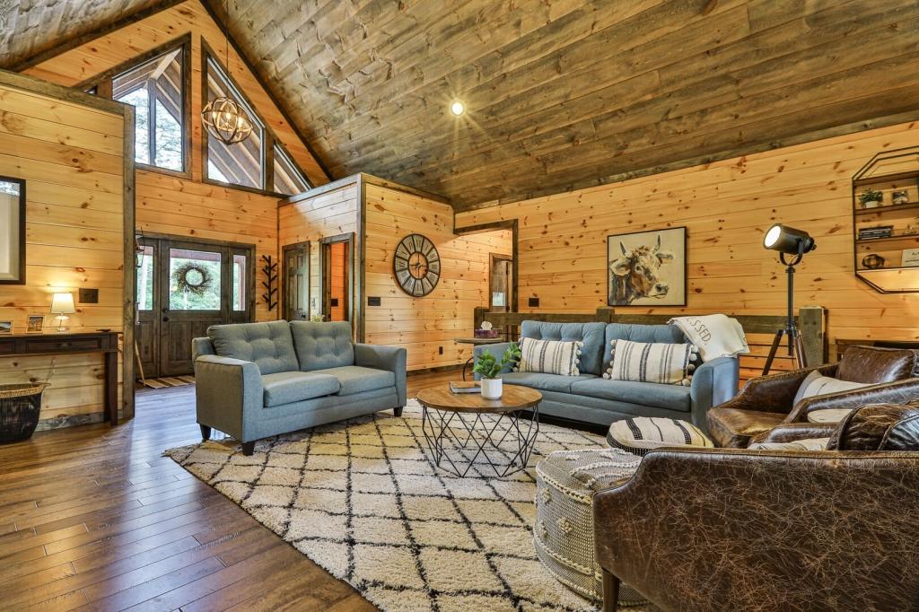 Highlands Retreat, Beautiful Cabin rental in Mineral Bluff has 3 bedrooms, 3 bathrooms, 6 sleeps, 2 minimum stay Cabin for rent in Mineral Bluff Georgia with the amenities and near by attractions , Deck/Patio, Fireplace, Game Room, Hot Tub, Kitchen, Parking, Porch / Veranda, Basic Soaps, Dining Area, Dishwasher, Living Room, Outdoor Grill, Refrigerator, Television, Toilet Paper, Washer/Dryer Back deck, Theater chairs, Decorated dining area