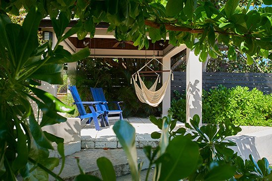 Upstairs you can also find our gym, complete with treadmill, bicycle, weights, and yoga equipment, overlooking the atrium and out to sea. In front of the gym is a seating area with ceiling fans and doors leading onto an open deck with a pergola. A small refrigerator and bar are tucked around the corner from this area, so our upstairs guests can have their morning coffee and juice as soon as they wake.