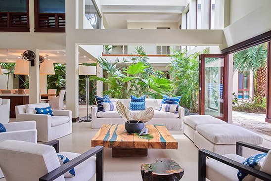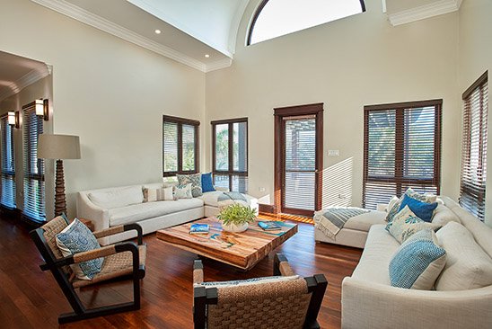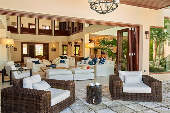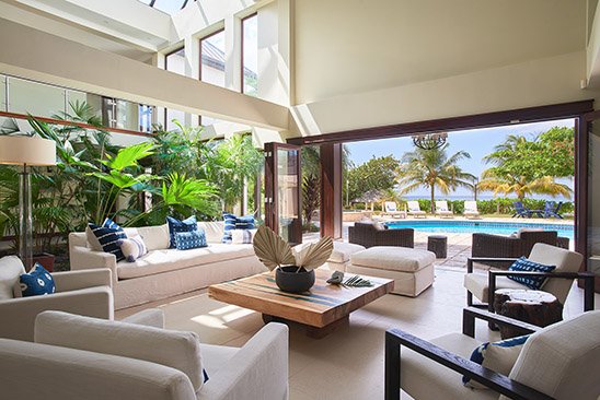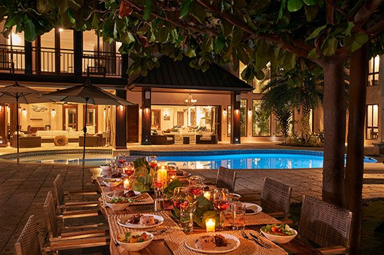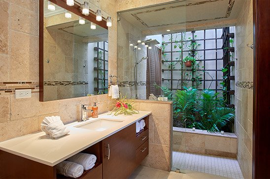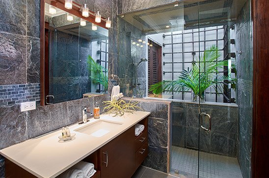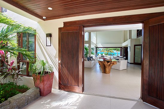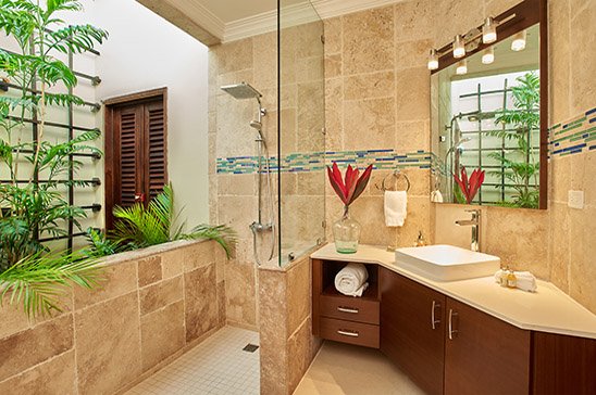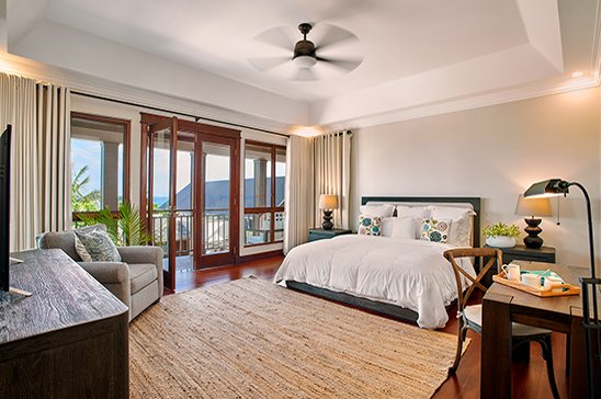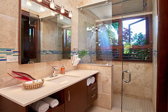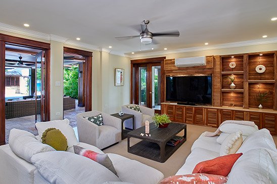 The central atrium is 2 stories high to capture the tropical breezes and opens straight onto the pool deck. Two water features with lush plants, koi pond, and waterfall highlight the atrium and brings the outdoors inside. The teak indoor dining table and buffet are set around the atrium, complete with wine cooler, multiple seating areas to accommodate everyone comfortably, and breakfast nook for the early risers. A powder room is also located in this living area for the convenience of our guests.
