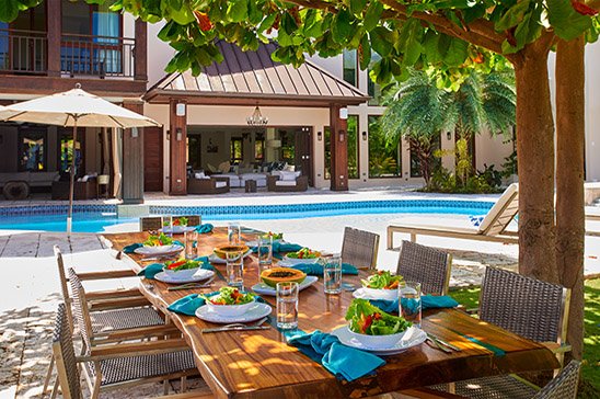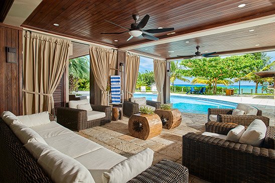To the right of this living area is the TV room with spacious seating and an 80” Smart TV with internet for streaming. And a door from the TV room leads into the games room with tables and chairs set up for board games. This room also has a small fridge and bar for easy access. The games room opens directly onto the covered outdoor dining/living areas, which are part of our pool deck. These offer more outdoor living while sheltering our guests from the hot tropical sun.