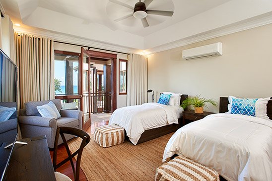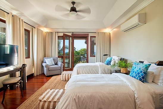 Twin Beds, A/C, Ceiling Fan, 49” Flat Screen TV, Closet with Safe, Veranda with Chairs Overlooking Pool and Garden and Sea, Shower with Windows