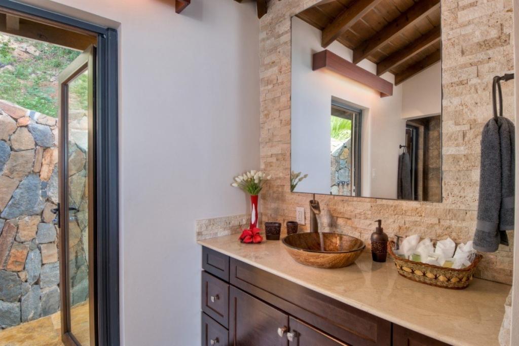 The main house with its large rock boulders in the living room & high ceilings gives you a very spacious & luxurious feel to this property. Some wonderful art work also greets you when you enter the villa. The kitchen is fully equipped with just about everything you need to create your own masterpiece for lunch or dinner. There is also office space if you need to do a little work whilst on island. The living area has large bi-fold doors which open out to the covered deck space & the infinity edge pool where you can sit back & relax. There is also a rock waterfall fountain & tropical landscaping around you. Alfresco dining with a 12-seating table & chairs provide an excellent location to enjoy time with family or friends.