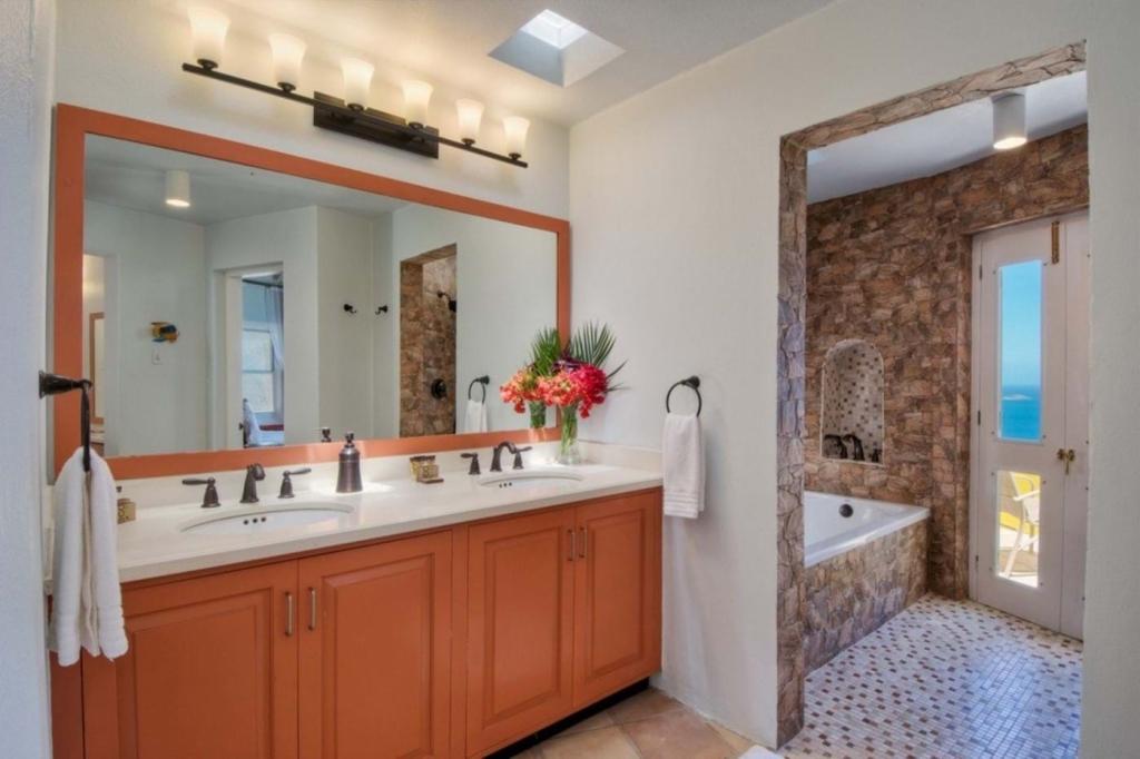 At the front of the main pavilion is a lower level bedroom with 4-poster bed and en suite bathroom. There is a large shower and also enjoys a full kitchen which makes it a private suite from the rest of the house. At the rear of the deck on the lower floor is a bathroom with two further bedroom/bathroom suites on the upper floor, a King Bed or Twin Beds if you require this layout. The next two bedrooms/bathrooms (one has a bath tub) are one above the other and in a separate pavilion leading off the pool deck. The layout of this villa allow privacy for all its guests. The views from these bedrooms are stunning from their private verandas.