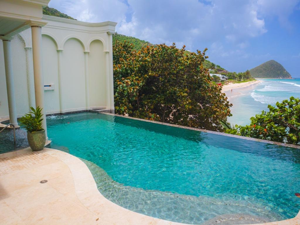 Mare Azzurro also has a large 2 bedroom guest suite that has its own private access from the outside, as well as connecting to the main house. It contains 2 King ensuite bedrooms, four poster beds, large showers and the finest appointments. The open living area is set between the two bedroom suites, offering complete privacy for guests. It is luxuriously furnished with an open living, dining and kitchen area. Guests enjoy, in total privacy, the second heated mosaic tiled pool with therapeutic jets and a massage waterfall overlooking the beach. There is also a lawn in front of the villa that leads to a private beach access. All rooms open onto the veranda with comfortable furnishings to relax and be overwhelmed with this exceptional location and views.