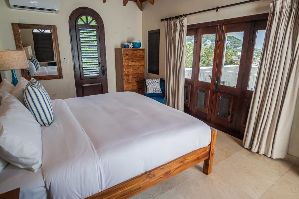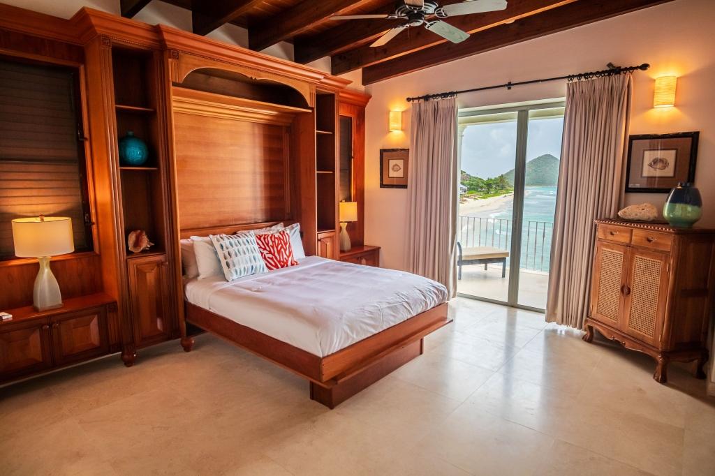 The villa has 2 master suites with king sized wooden carved four poster beds and exquisite furniture, their own sitting rooms, large walk in closets and marble bathrooms, with walk in showers. All bedrooms have glorious sea views, with pocketing doors and roll down shutters that open to a large veranda. One suite has its own Hot Springs Spa with amazing views overlooking the long sandy beach and across the ocean beyond, while the other has 2 bathrooms and a Murphy bed that converts the sitting room into another bedroom perfect for small children or guests. The artist’s studio has its own private balcony and uninterrupted view of the beach, ocean and myriad of islands beyond. The studio has its own bathroom, kitchen, bedroom and private entrance. At the top of the tower one arrives at the media room with a wet bar and home theatre in the round. Perched high above the activity below, this circular space provides another welcome retreat to relax, enjoy and be entertained in total comfort and seclusion.
