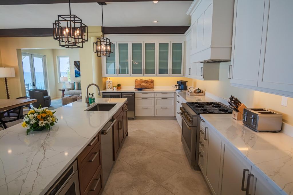 Mare Azzurro is a euphoric one of a kind property that will heighten your senses like no other. A stunning round Mediterranean tower replete with a grand cantilevered marble staircase, turned mahogany rail and antique chandelier from a Spanish Monastery, connects all spaces in the villa. The villa has a Great Room that opens completely up to expansive wrap around covered porches opening to an elevated swimming pool and a large custom kitchen, perfect for entertaining. The open kitchen is every chef’s delight, including 2 dishwashers, a 6 burner commercial stove, a large panelled refrigerator/freezer, floor to ceiling maple raised panelled custom cabinetry and a hidden flat screen television that can be viewed from the granite breakfast bar that seats ten. The entire floor has an integrated sound system. Walk right out from the great room to the state of the art glass elevated mosaic tiled heated infinity pool that joins with the sea. The pool has two waterfalls, one European therapeutic massage, and one rain, with amazing views, surrounded by columns and arches. On the deck enjoy the fully equipped outdoor kitchen with infra-red stainless steel BBQ, gas burners, sink and refrigerator.