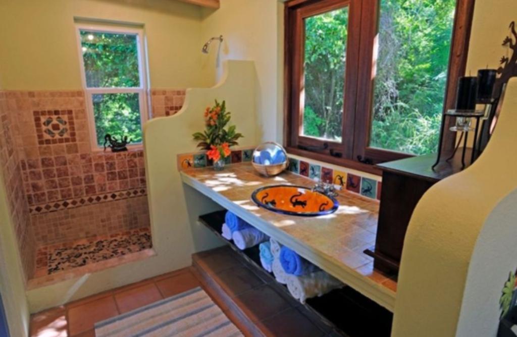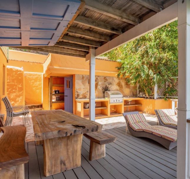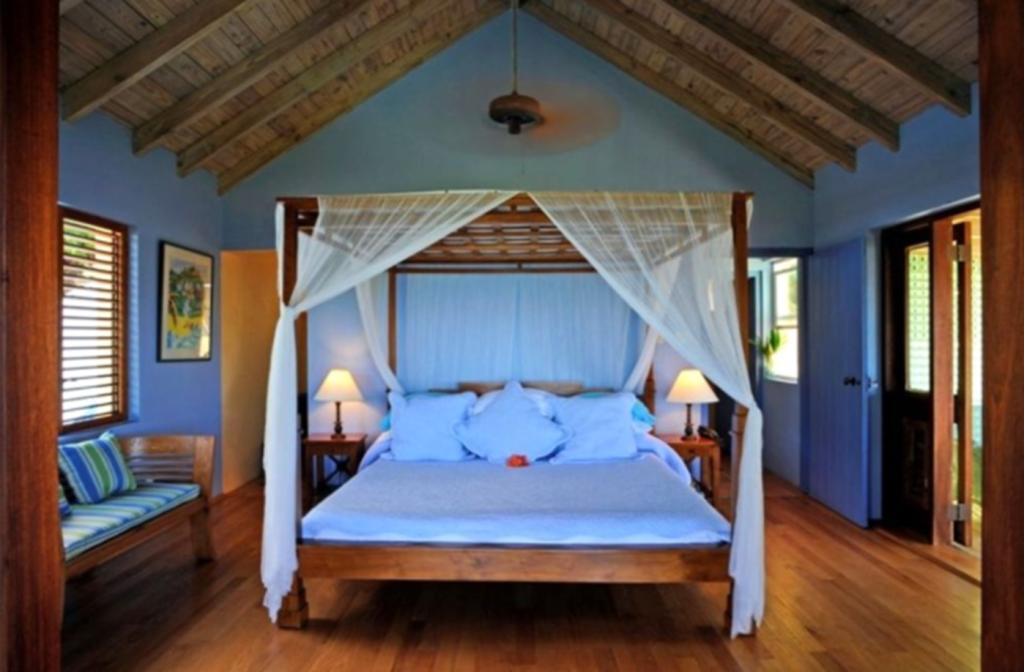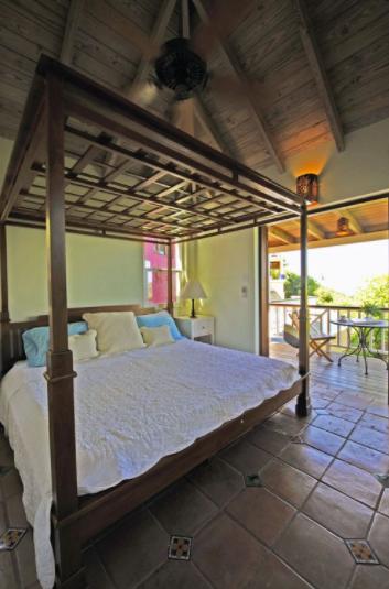 The Master Bedroom is air-conditioned with its vaulted ceiling and own private veranda. The views are reaching out over the ocean. Its King 4 Poster Bed is reached by stairs leading up from the living area. There is also a comfortable sofa to relax in after a hard day on vacation. There is a table and chairs if you enjoy reading or you want to do a bit of work whilst you are on island. The en suite Bathroom has a walk-in shower, twin sinks (his and hers).